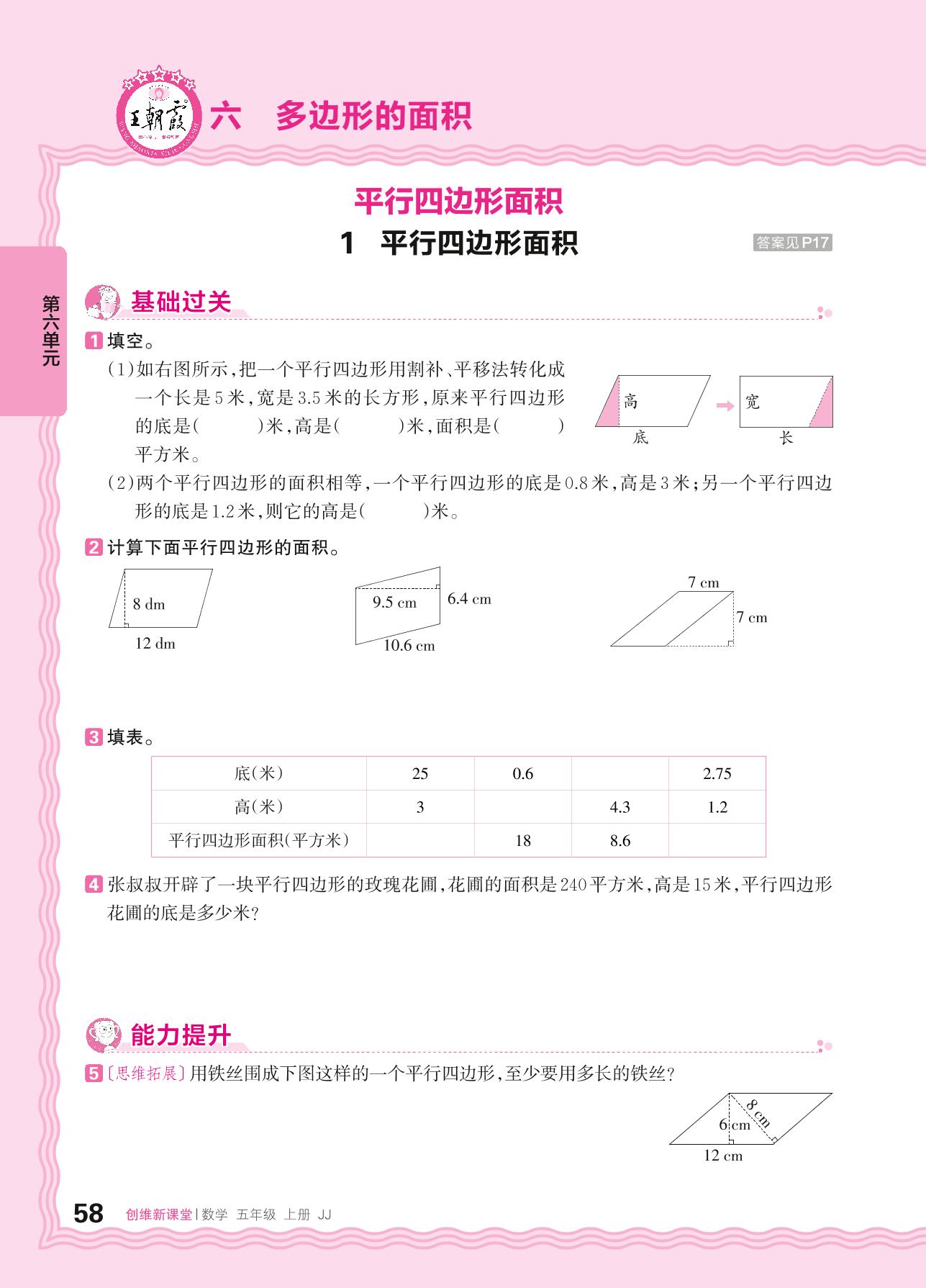 2024秋上册五年级数学冀教版 第六单元 多边形的面积——1. 平行四边形面积