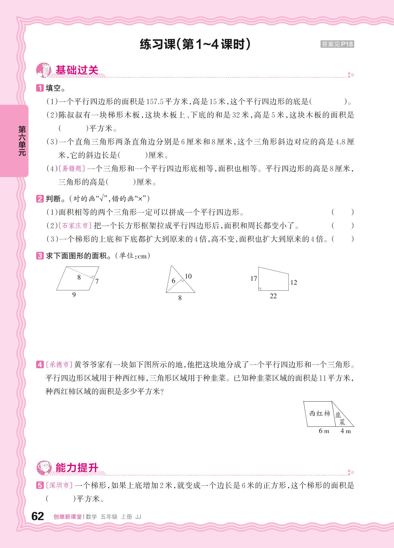 2024秋上册五年级数学冀教版 第六单元 多边形的面积——平行四边形面积、三角形面积、梯形面积练习课