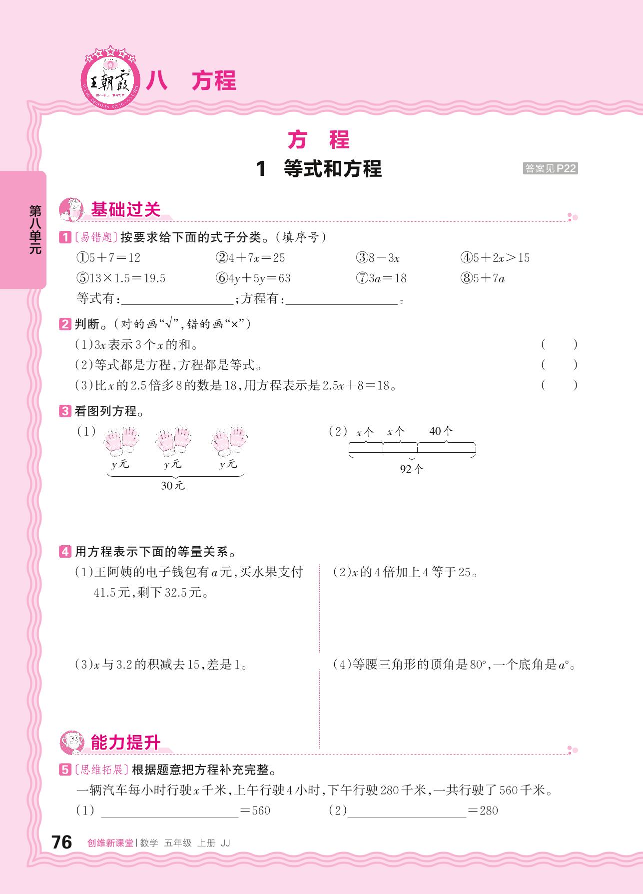 2024秋上册五年级数学冀教版 第八单元 方程——1. 等式和方程