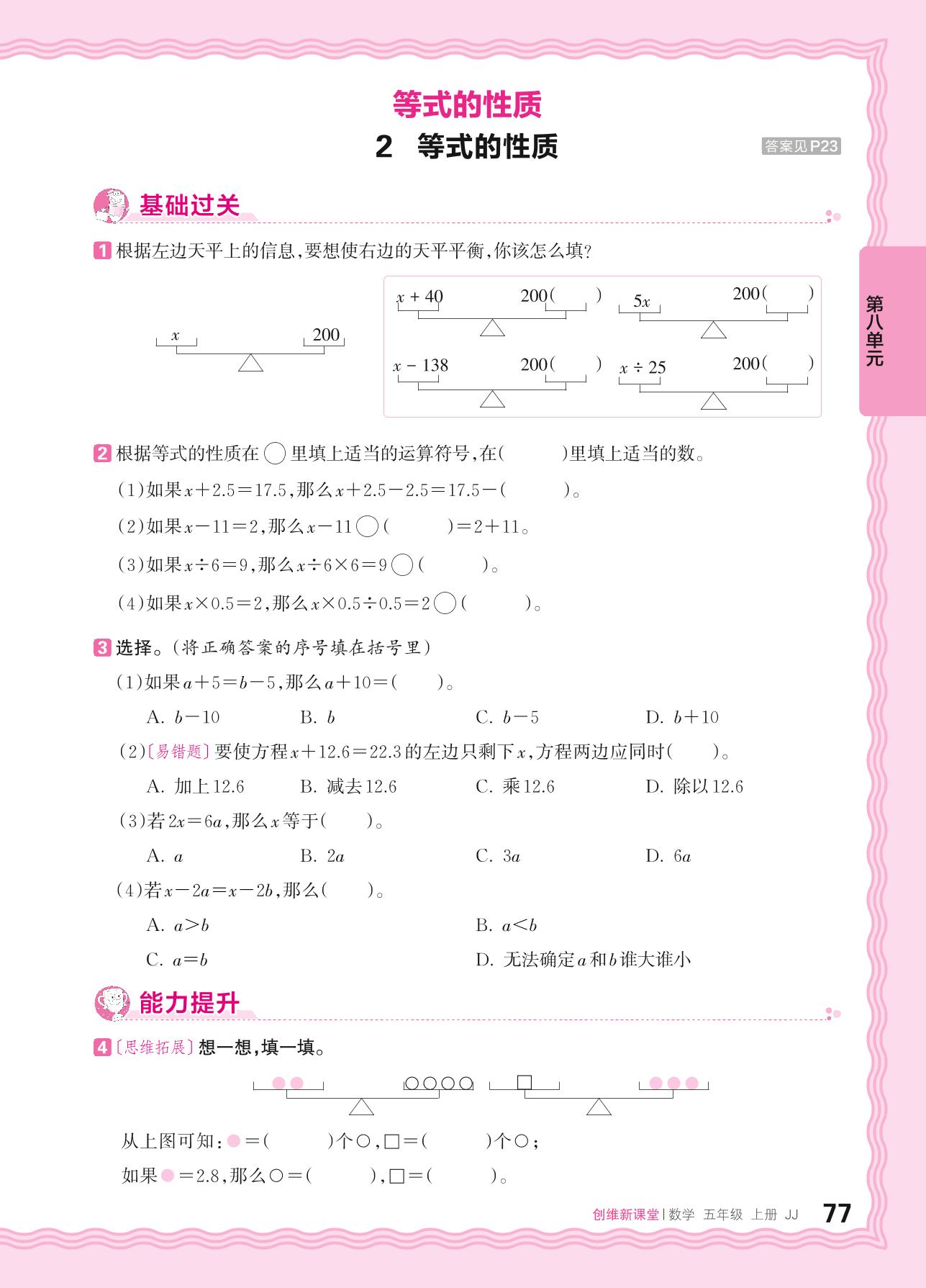 2024秋上册五年级数学冀教版 第八单元 方程——2. 等式的性质