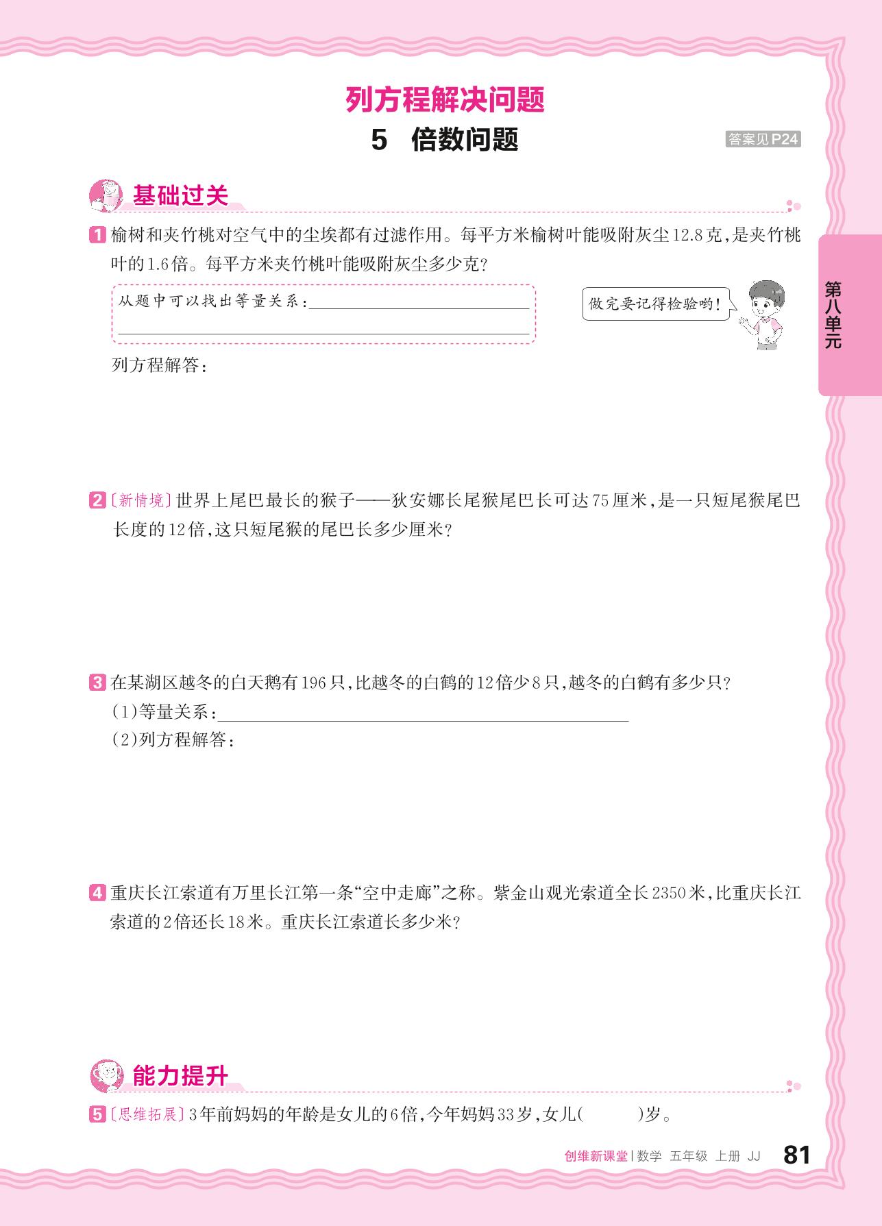 2024秋上册五年级数学冀教版 第八单元 方程——5. 倍数问题