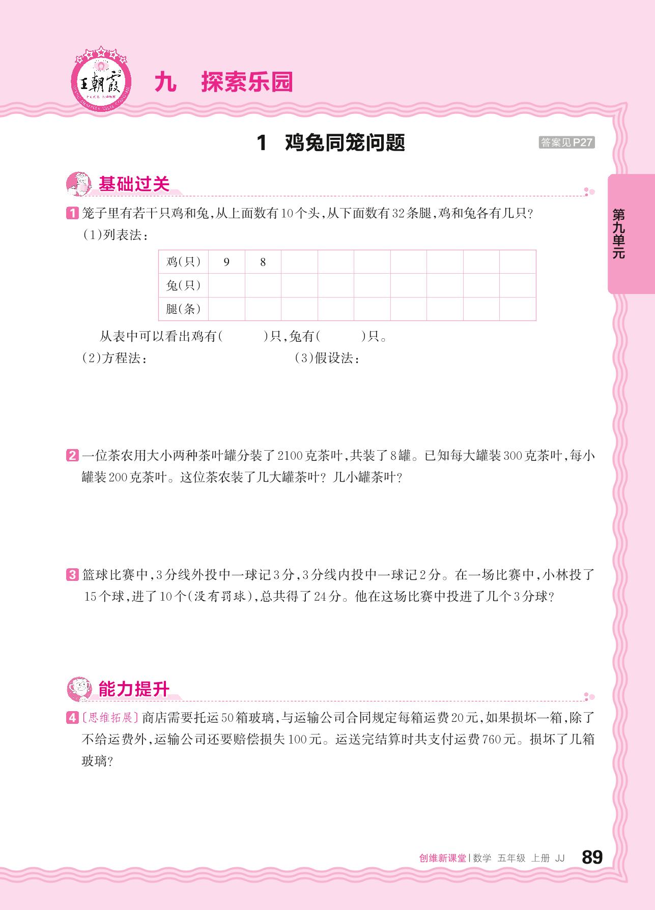 2024秋上册五年级数学冀教版 第九单元 探索乐园——1. 鸡兔同笼问题