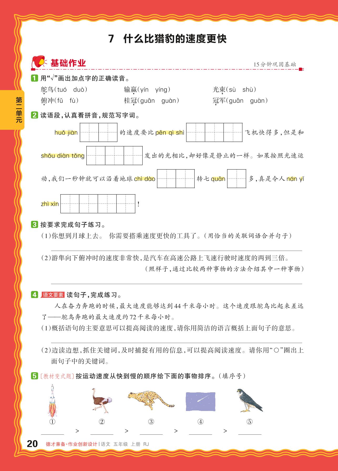 2024秋上册五年级语文人教版 第二单元 阅读策略:提高阅读的速度——7. 什么比猎豹的速度更快