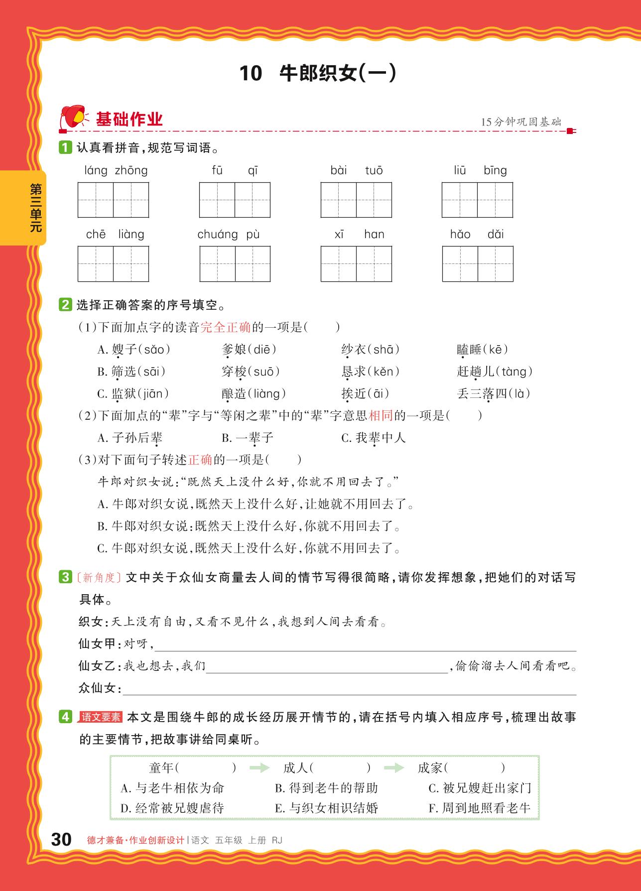 2024秋上册五年级语文人教版 第三单元 民间故事——10. 牛郎织女(一)