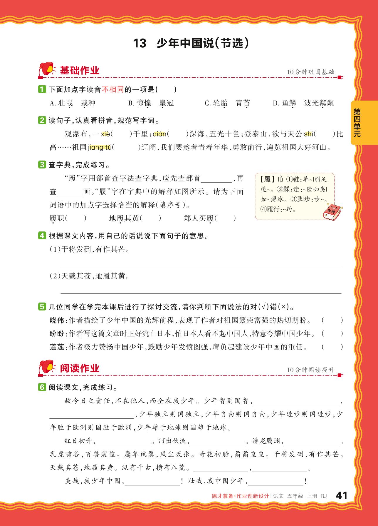 2024秋上册五年级语文人教版 第四单元 爱国情怀——13. 少年中国说(节选)