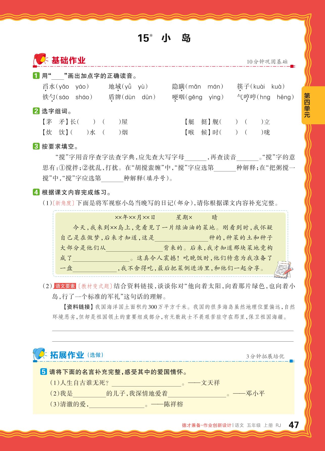 2024秋上册五年级语文人教版 第四单元 爱国情怀——15. 小岛