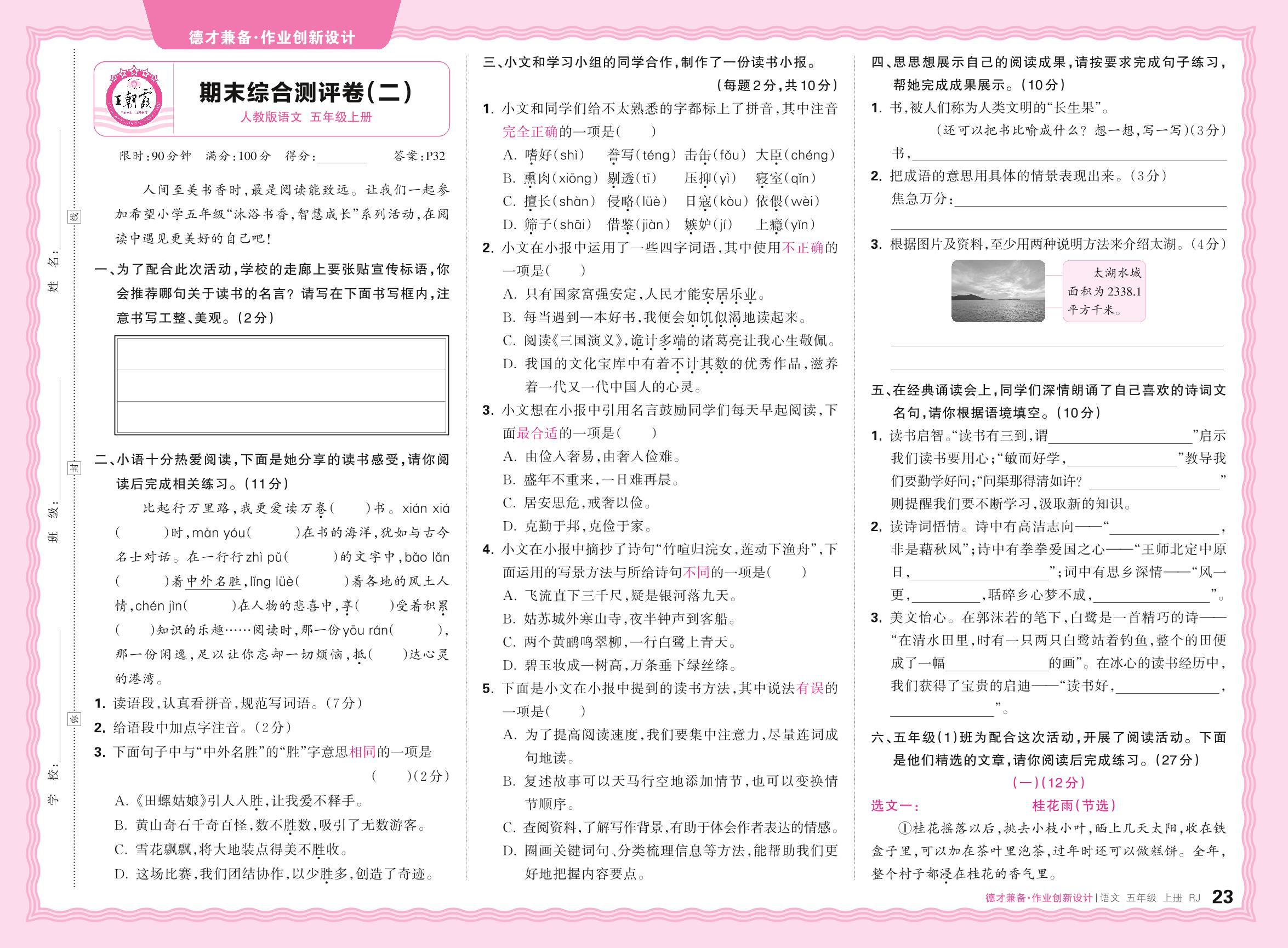 2024秋上册五年级语文人教版 期末综合测评卷(二)