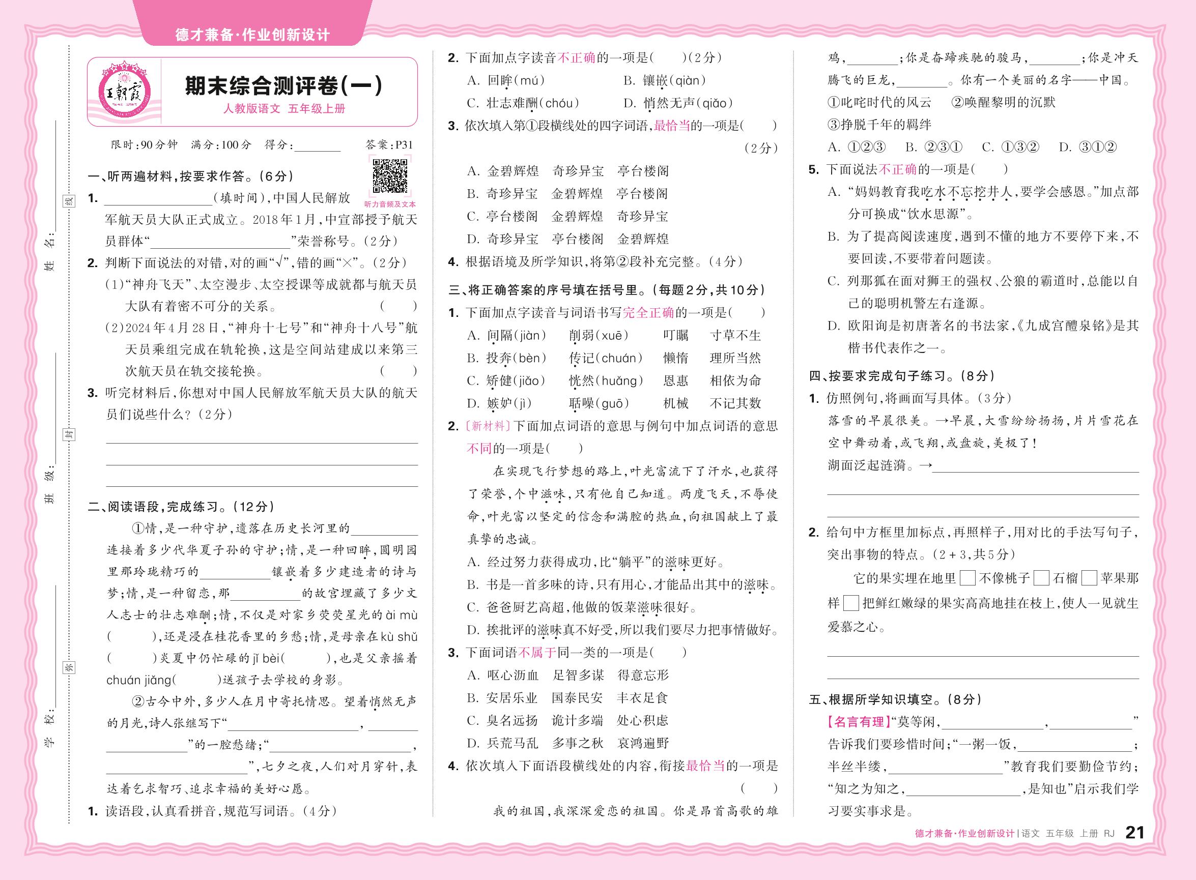 2024秋上册五年级语文人教版 期末综合测评卷(一)