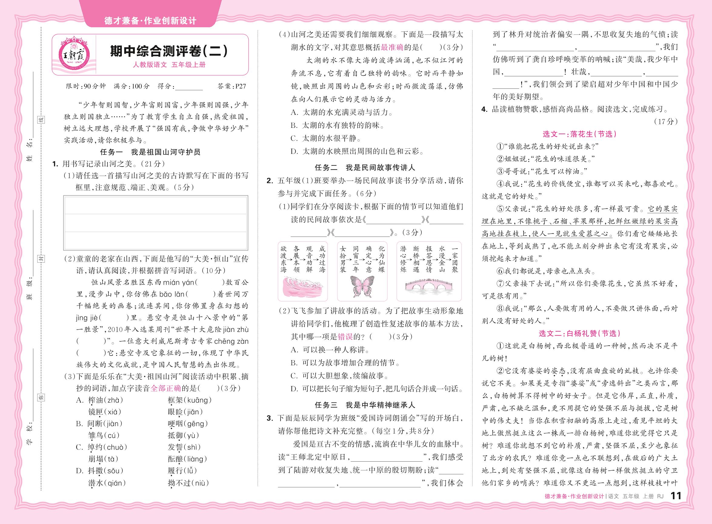 2024秋上册五年级语文人教版 期中综合测评卷(二)