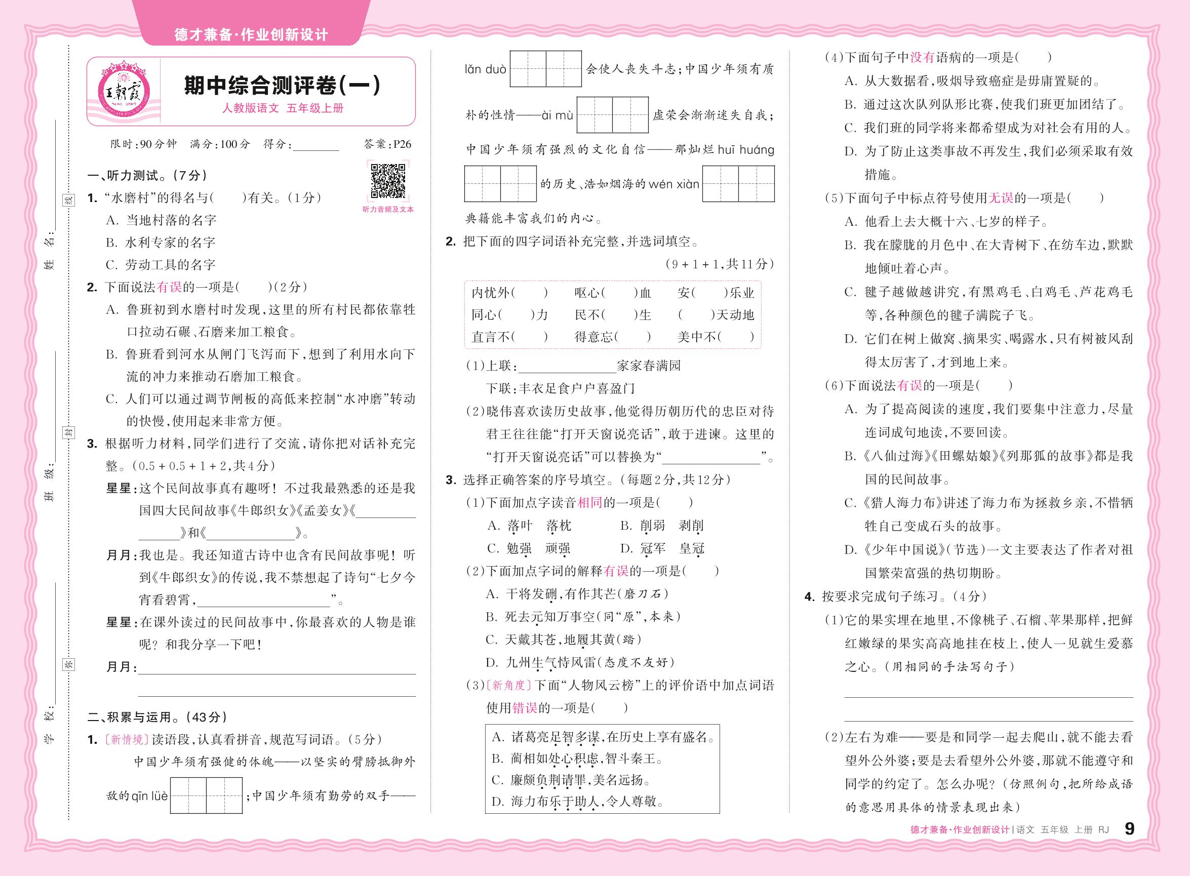 2024秋上册五年级语文人教版 期中综合测评卷(一)