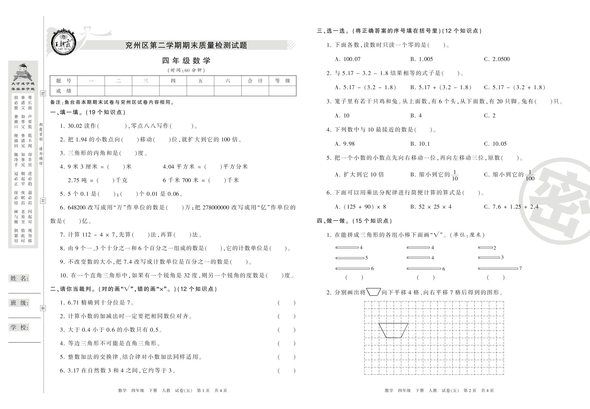 2015-2016学年第二学期济宁市兖州区四年级数学试卷(人教版)【5】