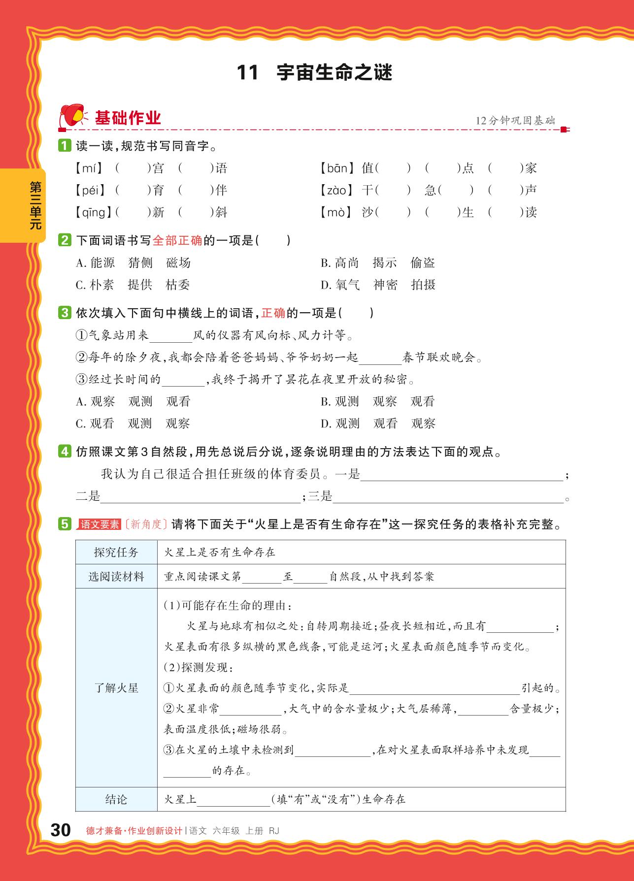 2024秋上册六年级语文人教版 第三单元 阅读策略:有目的地阅读——11. 宇宙生命之谜