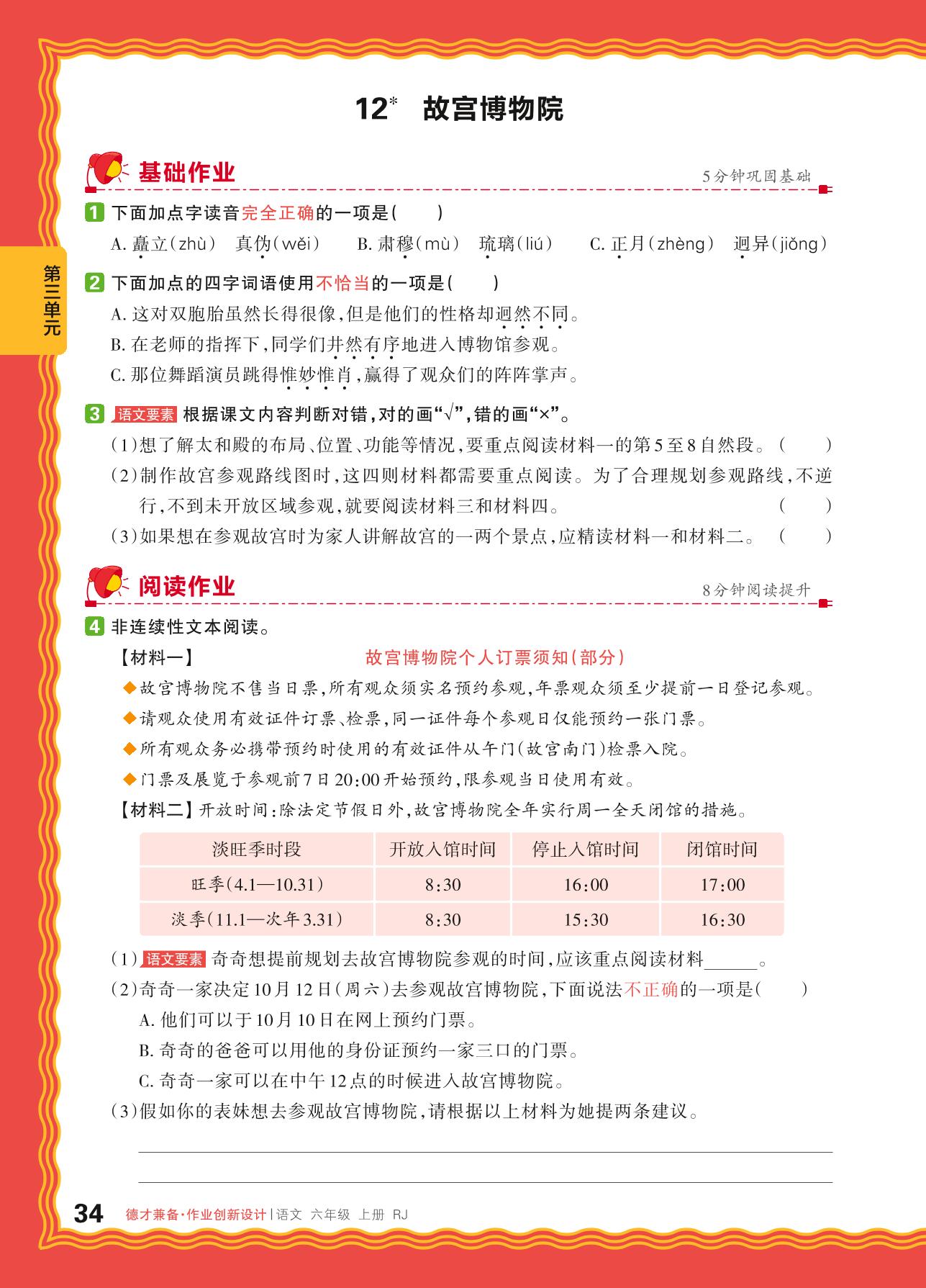 2024秋上册六年级语文人教版 第三单元 阅读策略:有目的地阅读——12. 故宫博物院