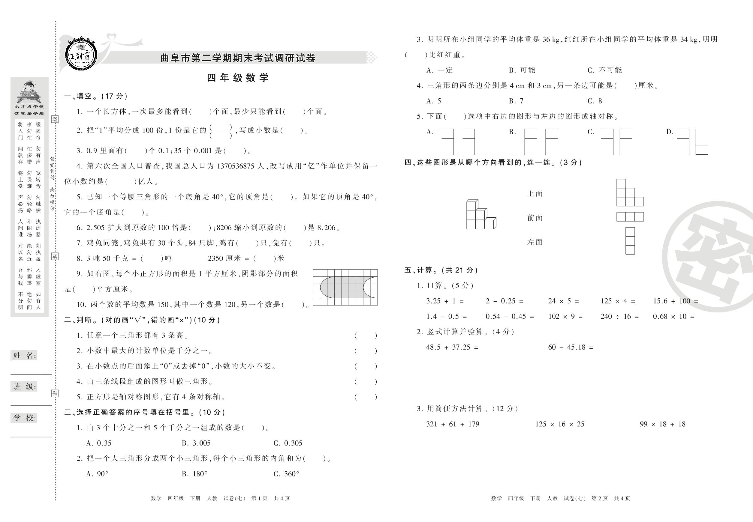 2015-2016学年第二学期曲阜市四年级数学试卷(人教版)【7】