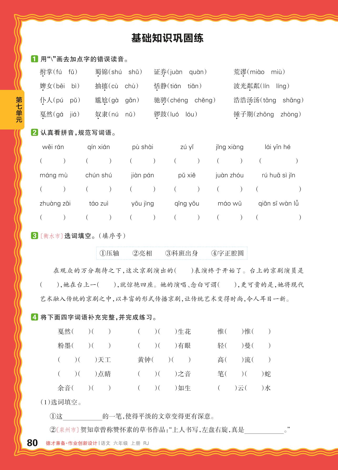 2024秋上册六年级语文人教版 第七单元 艺术之美——基础知识巩固练