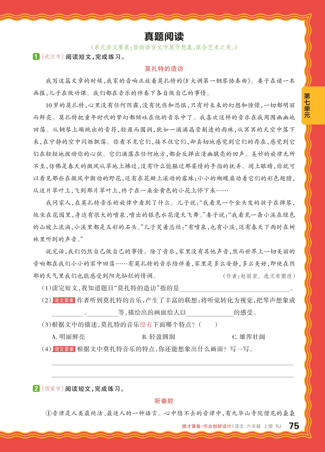 2024秋上册六年级语文人教版 第七单元 艺术之美——真题阅读