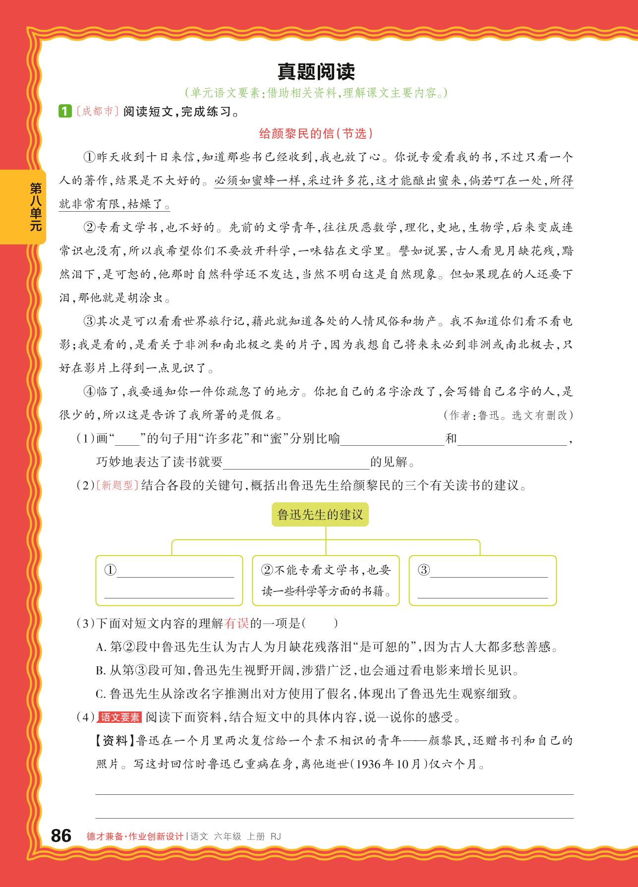2024秋上册六年级语文人教版 第八单元 走近鲁迅——真题阅读