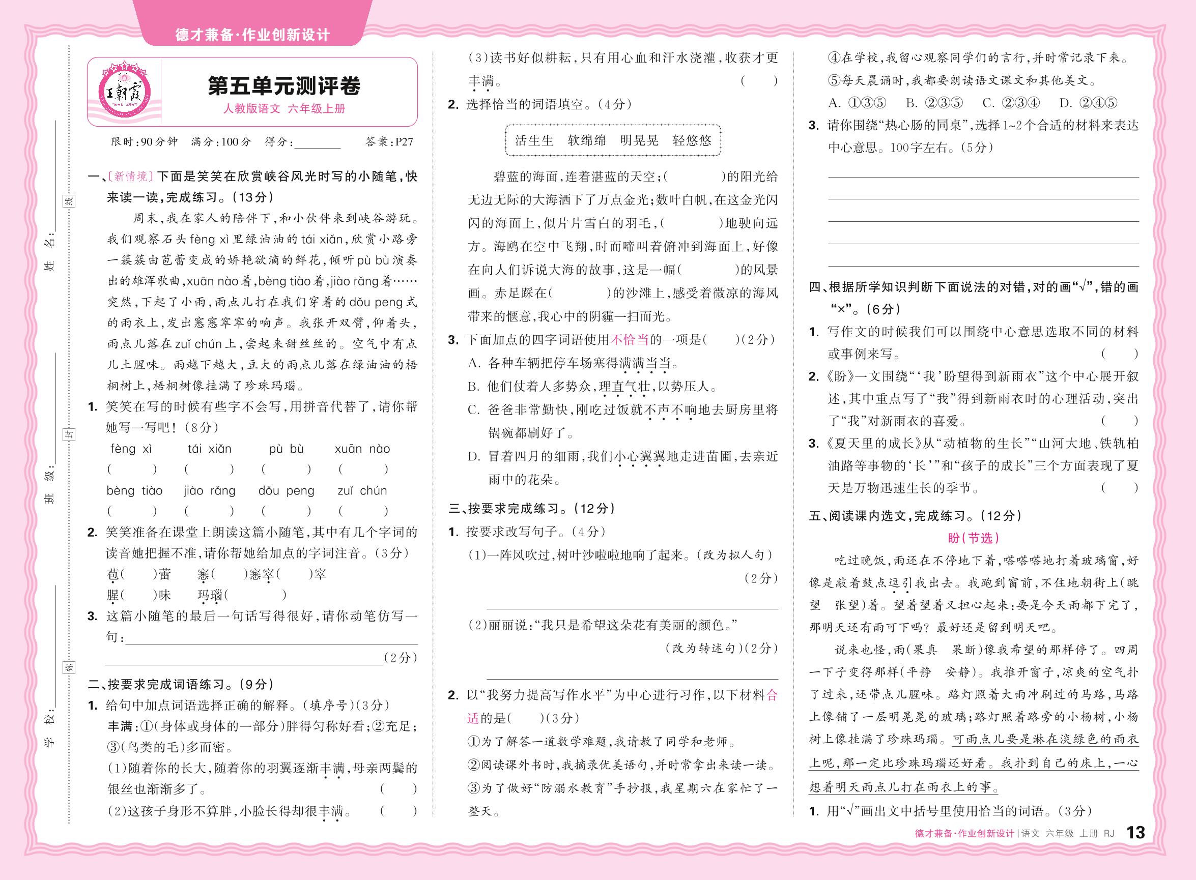 六年级语文人教版上册单元卷