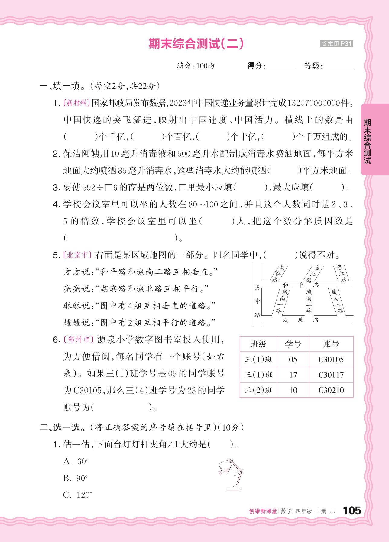 2024秋上册四年级数学冀教版 期末综合测试(二)