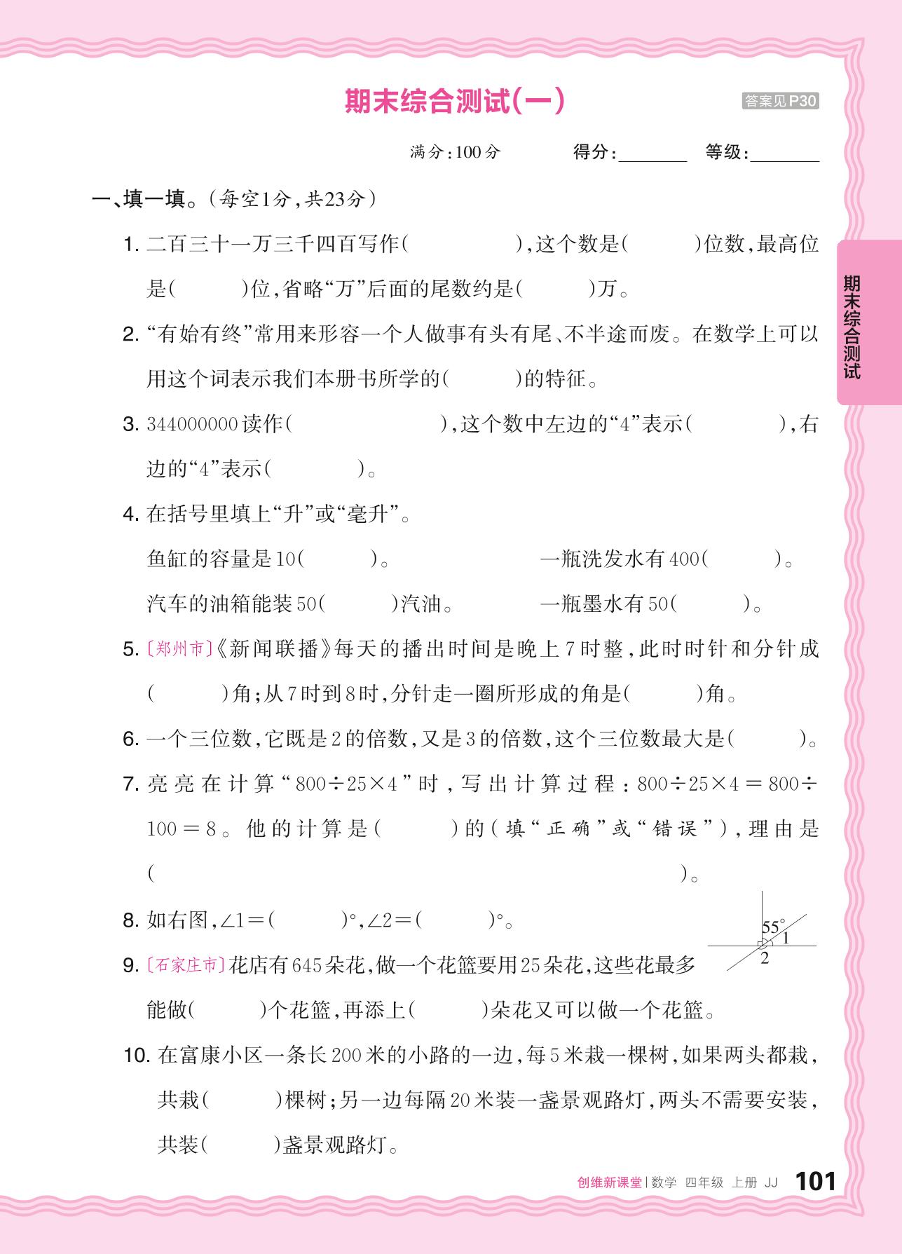 2024秋上册四年级数学冀教版 期末综合测试(一)