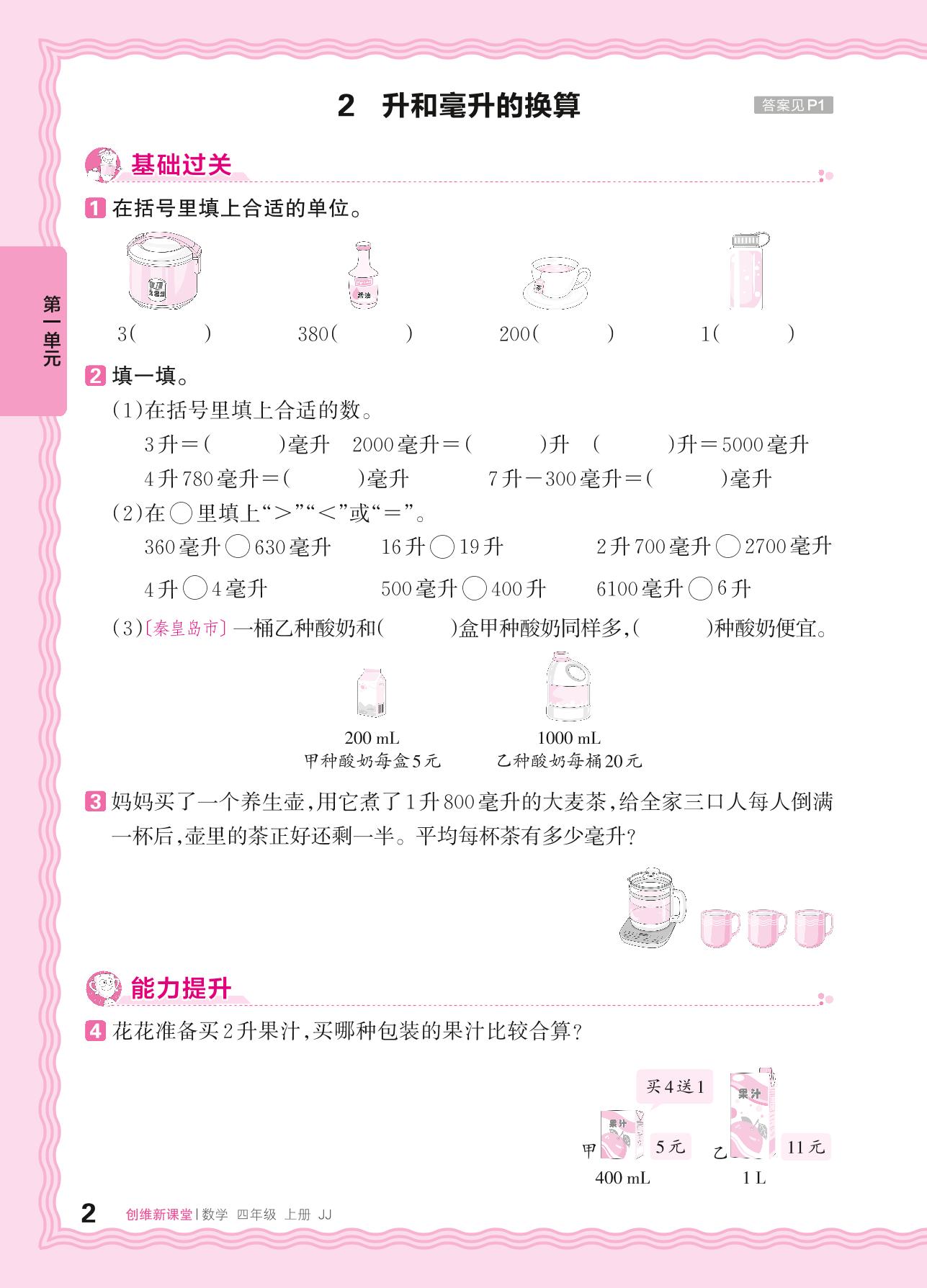 2024秋上册四年级数学冀教版 第一单元 升和毫升——2. 升和毫升的换算