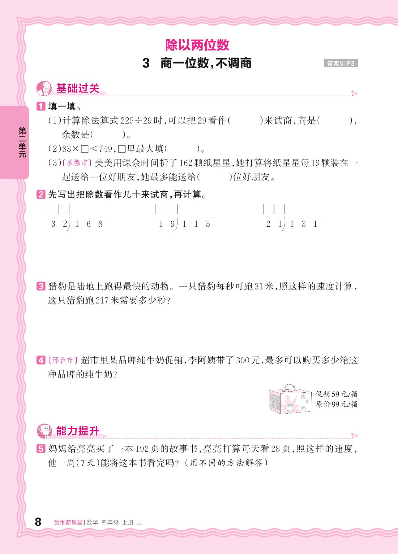 2024秋上册四年级数学冀教版 第二单元 三位数除以两位数——3. 商一位数,不调商