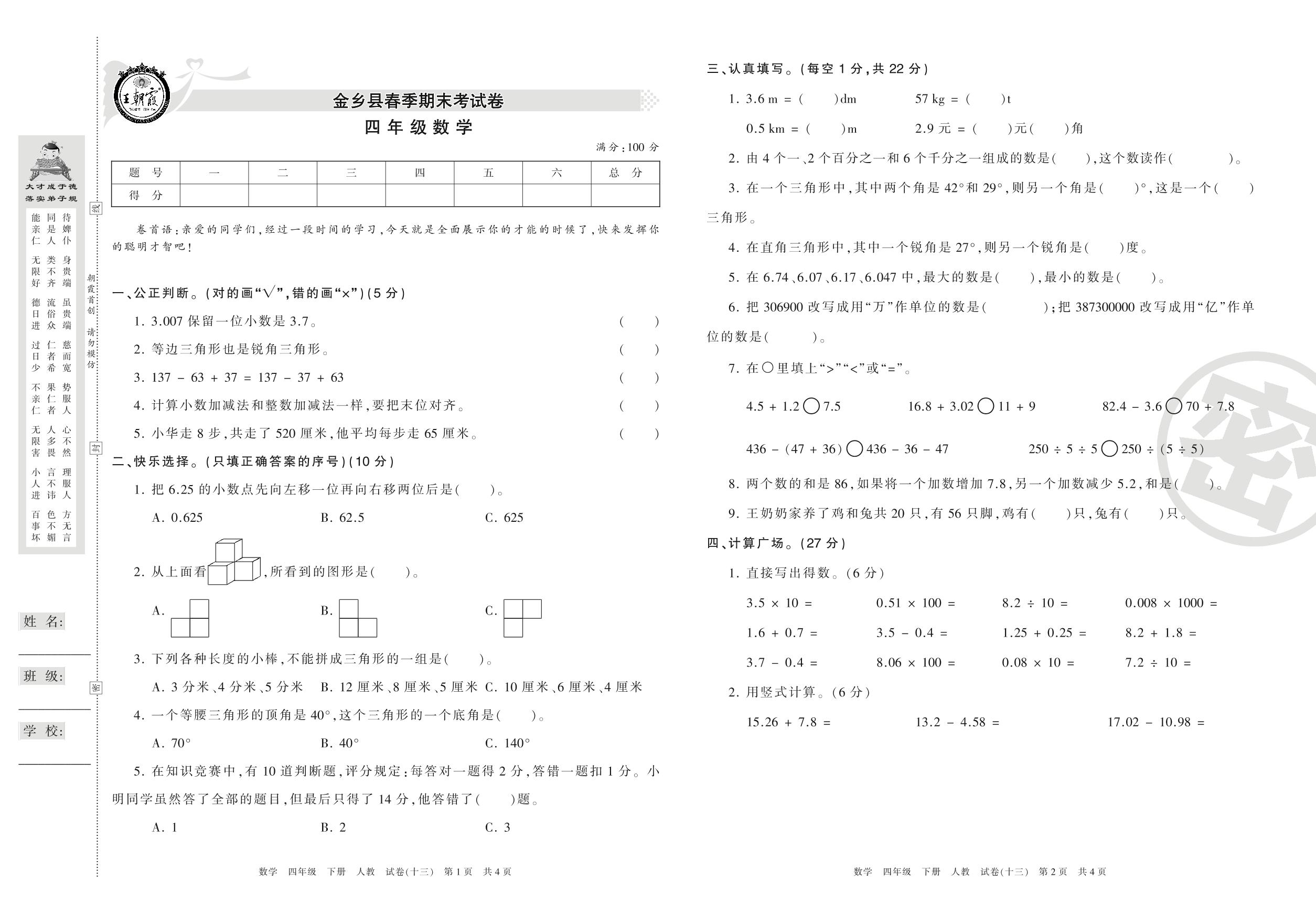 2015-2016学年第二学期济宁市金乡县四年级数学试卷(人教版)【13】