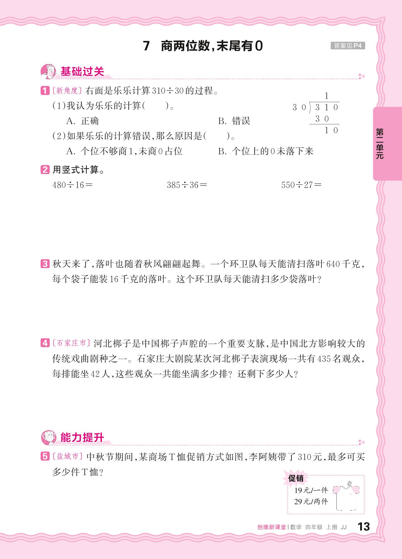 2024秋上册四年级数学冀教版 第二单元 三位数除以两位数——7. 商两位数,末尾有0