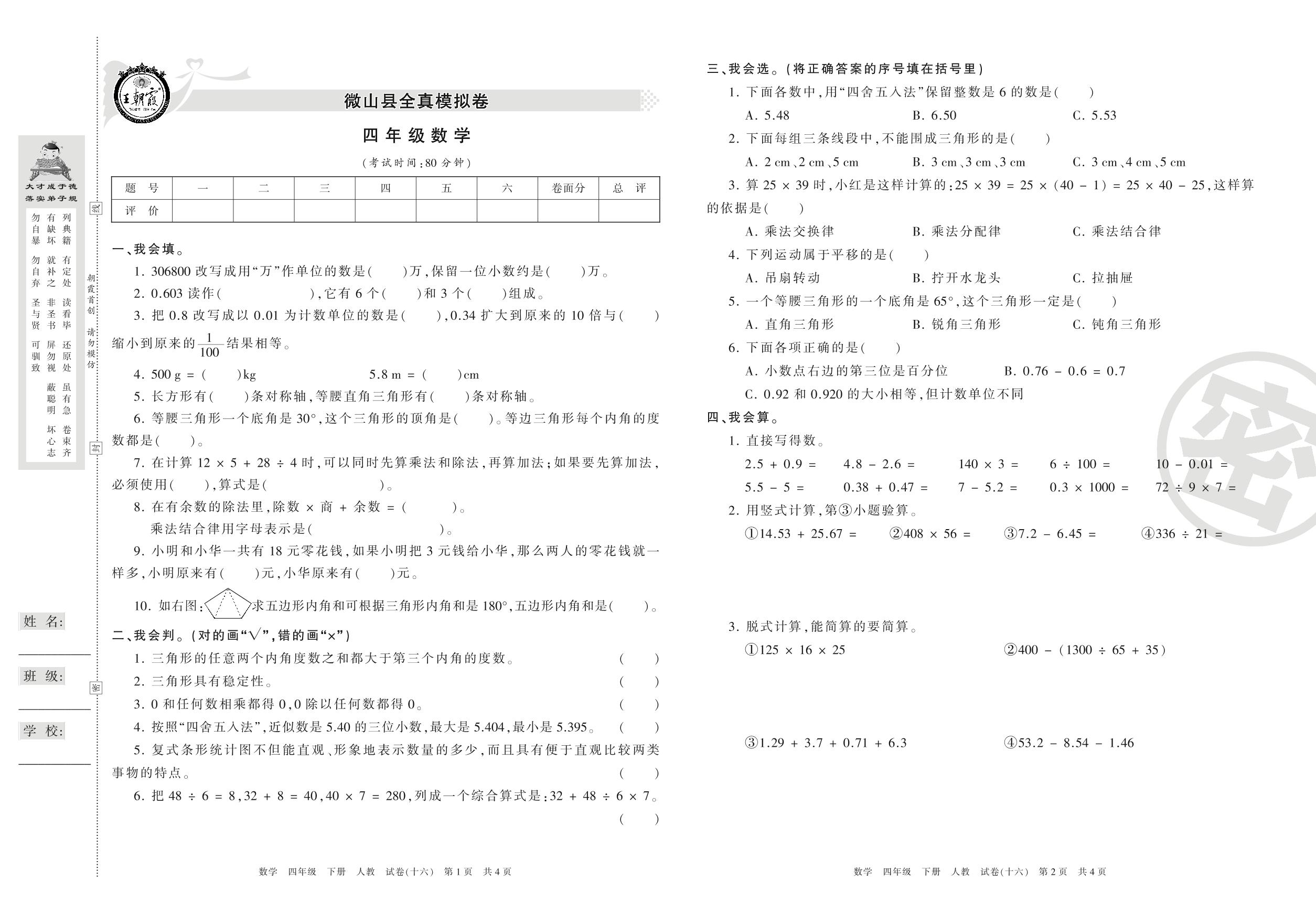 2015-2016学年第二学期济宁市微山县全真模拟卷四年级数学试卷(人教版)【16】