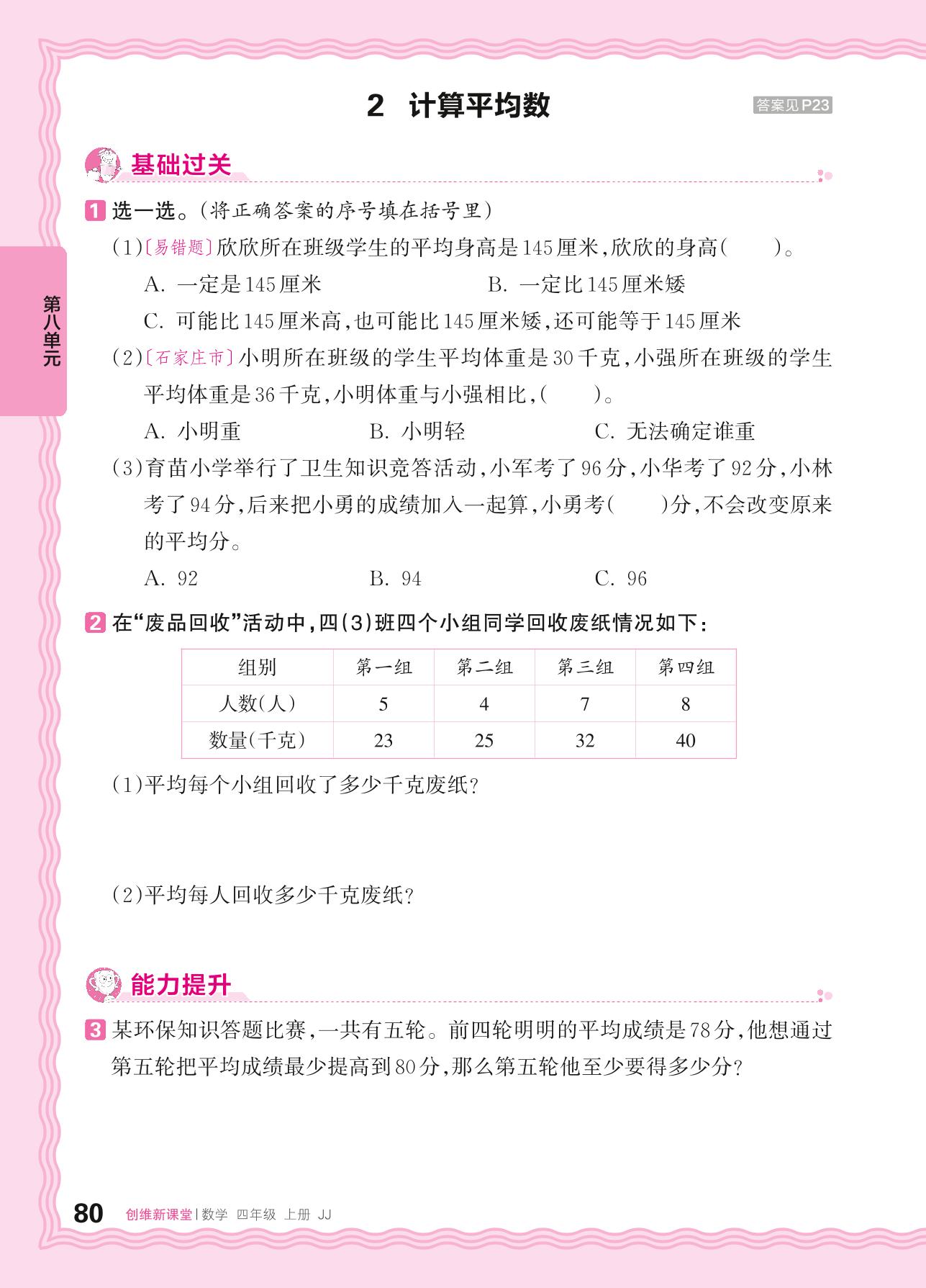 2024秋上册四年级数学冀教版 第八单元 平均数和条形统计图——2. 计算平均数