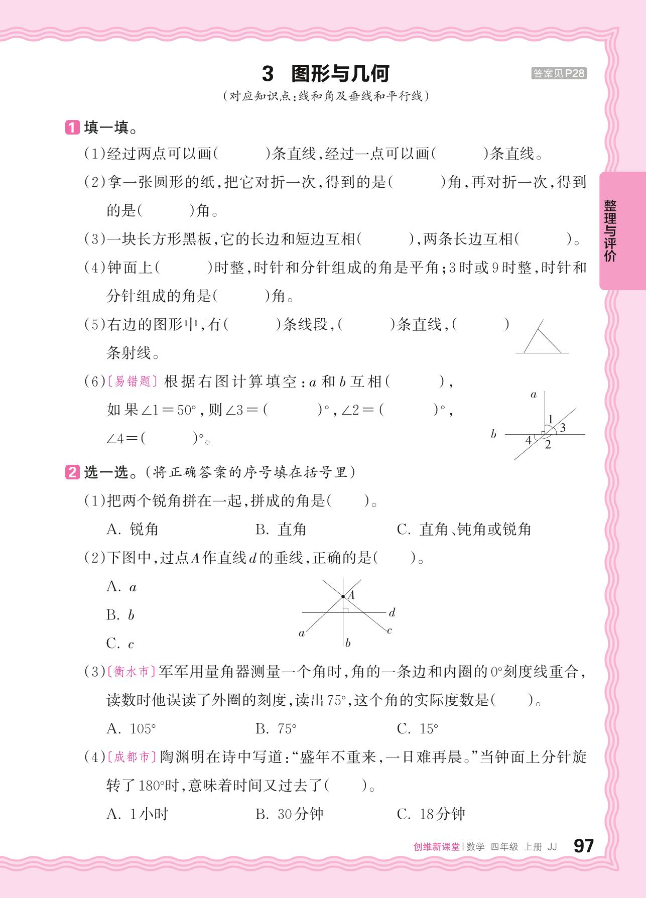 2024秋上册四年级数学冀教版 整理与评价(知识与技能)——3. 图形与几何