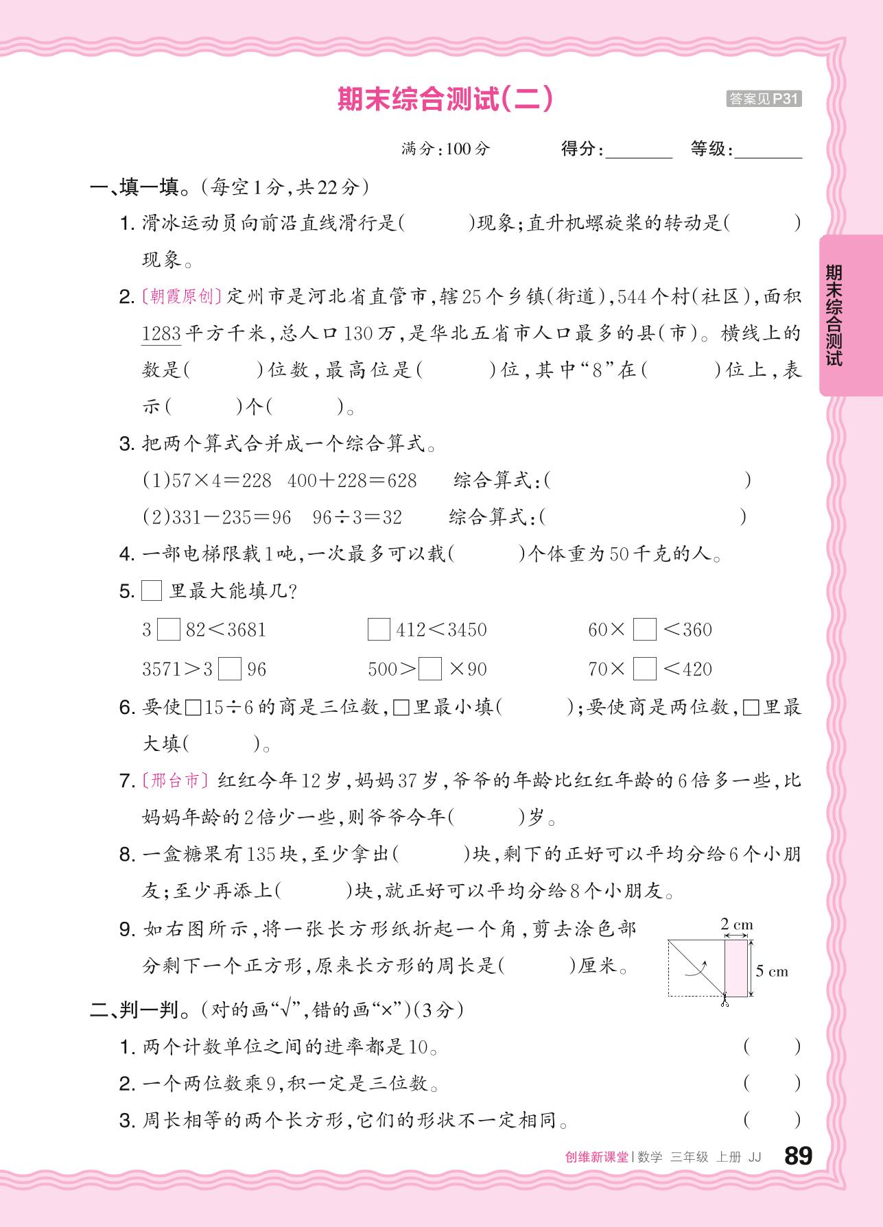 2024秋上册三年级数学冀教版 期末综合测试(二)