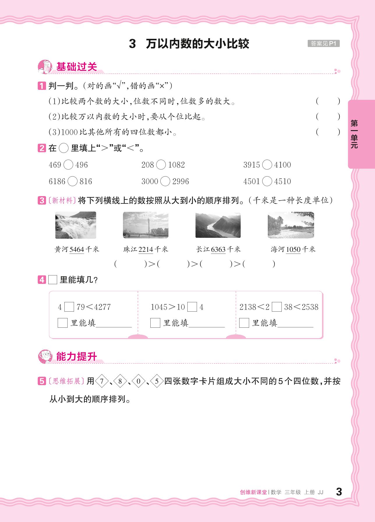 2024秋上册三年级数学冀教版 第一单元 生活中的大数——3. 万以内数的大小比较