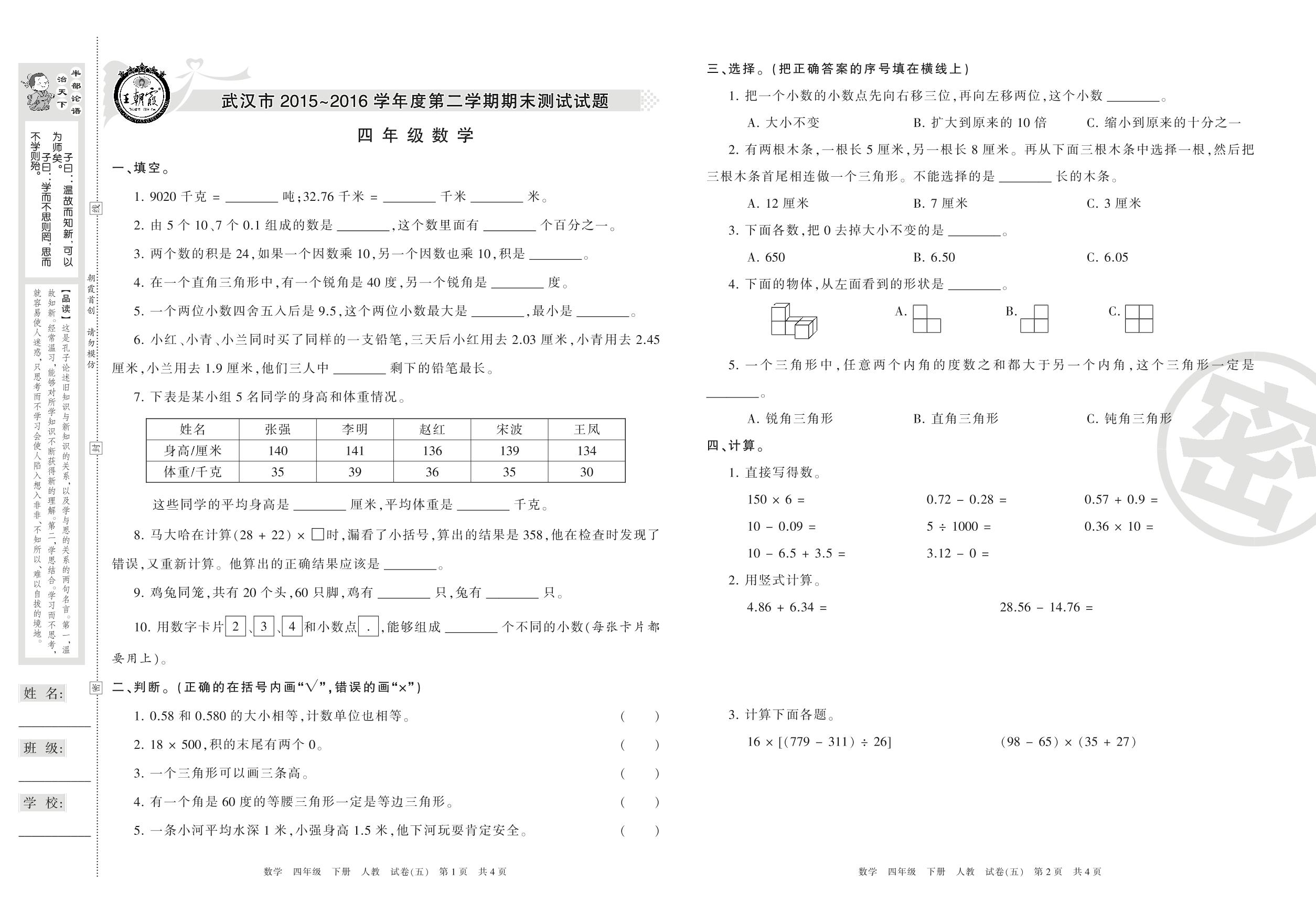 2015-2016学年第二学期武汉市四年级数学试卷(人教版)【5】