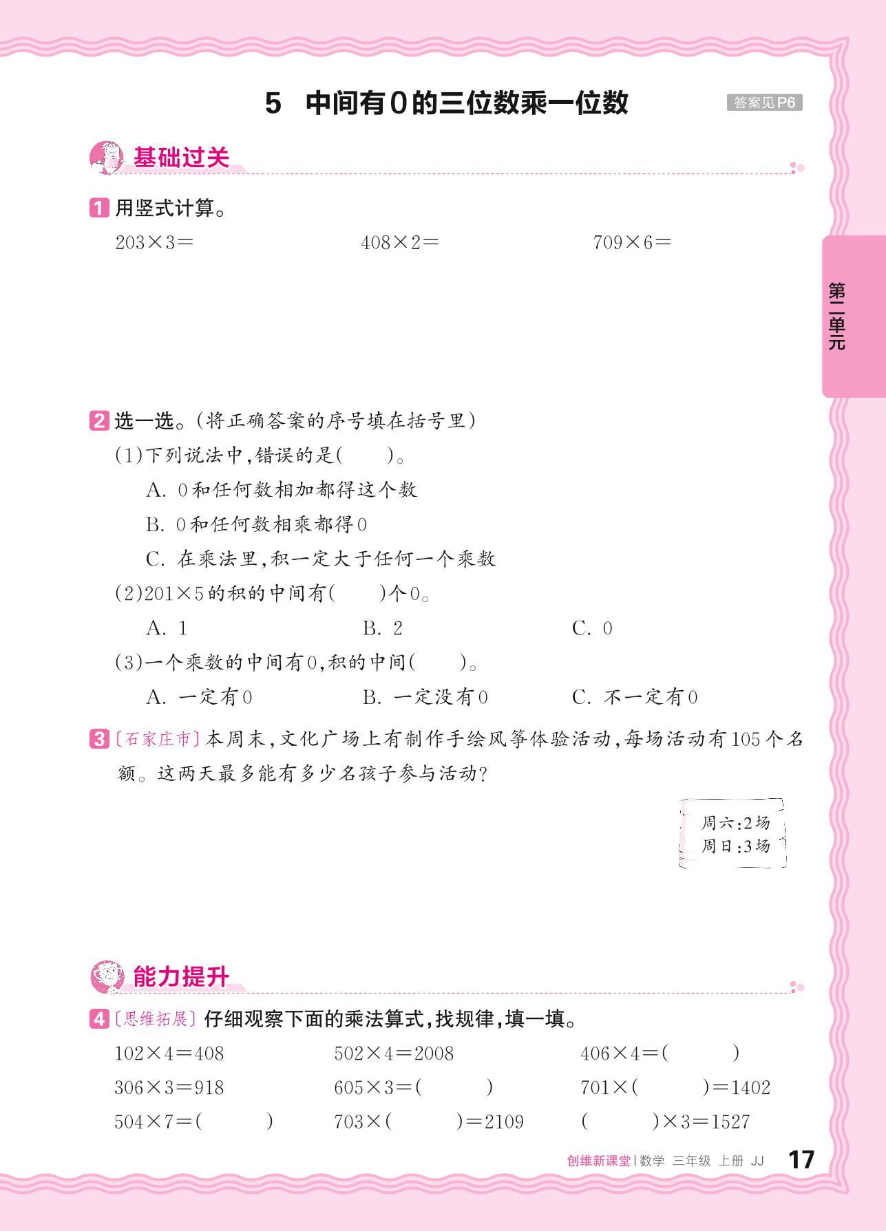 2024秋上册三年级数学冀教版 第二单元 两、三位数乘一位数——5. 中间有0的三位数乘一位数