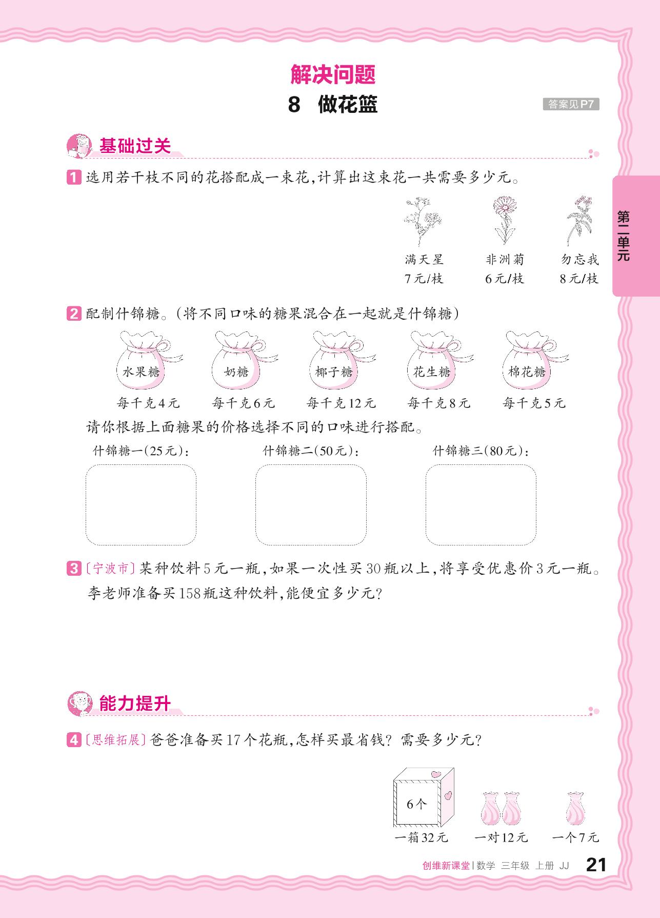 2024秋上册三年级数学冀教版 第二单元 两、三位数乘一位数——8. 做花篮