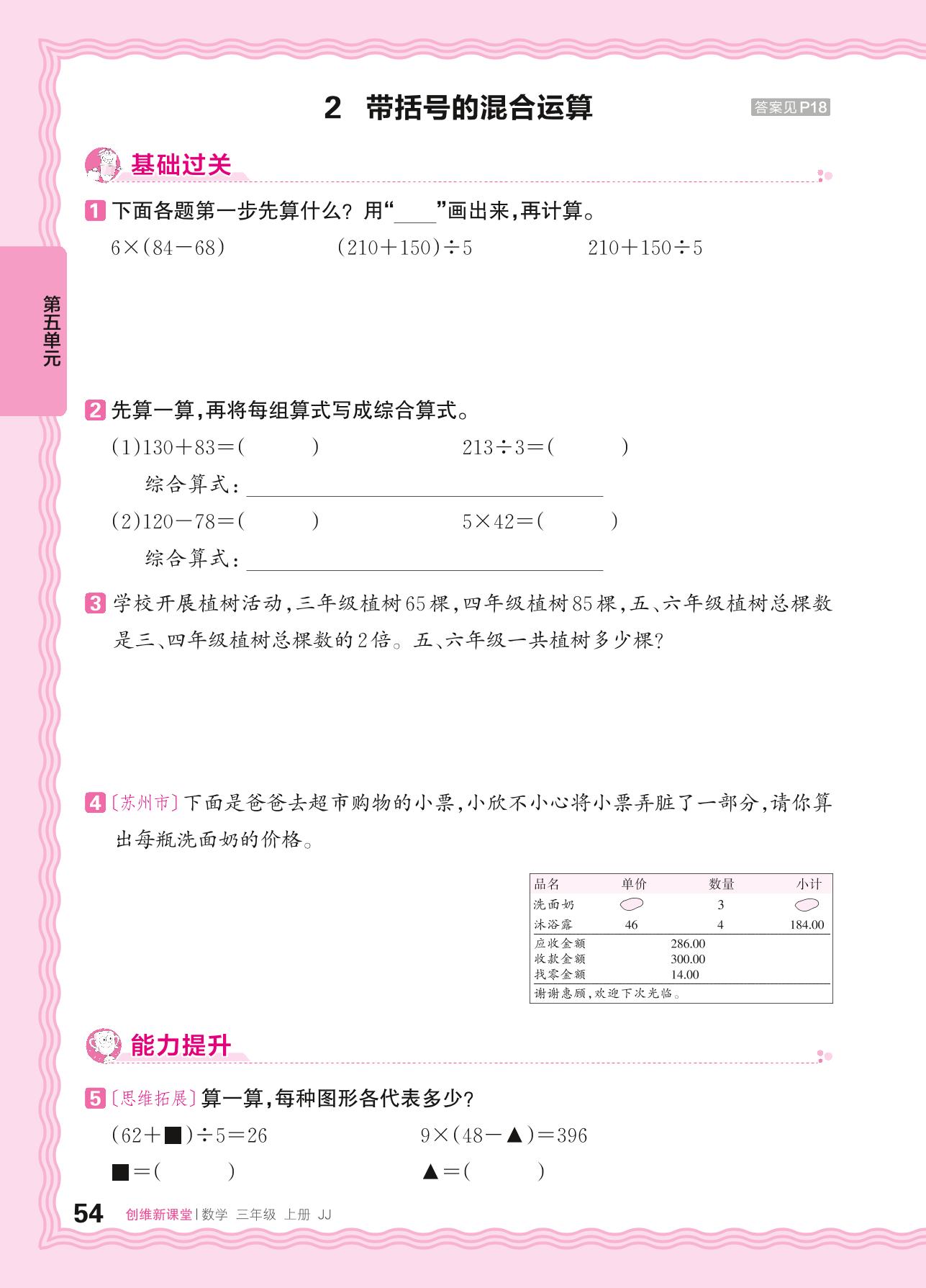 2024秋上册三年级数学冀教版 第五单元 四则混合运算(一)——2. 带括号的混合运算