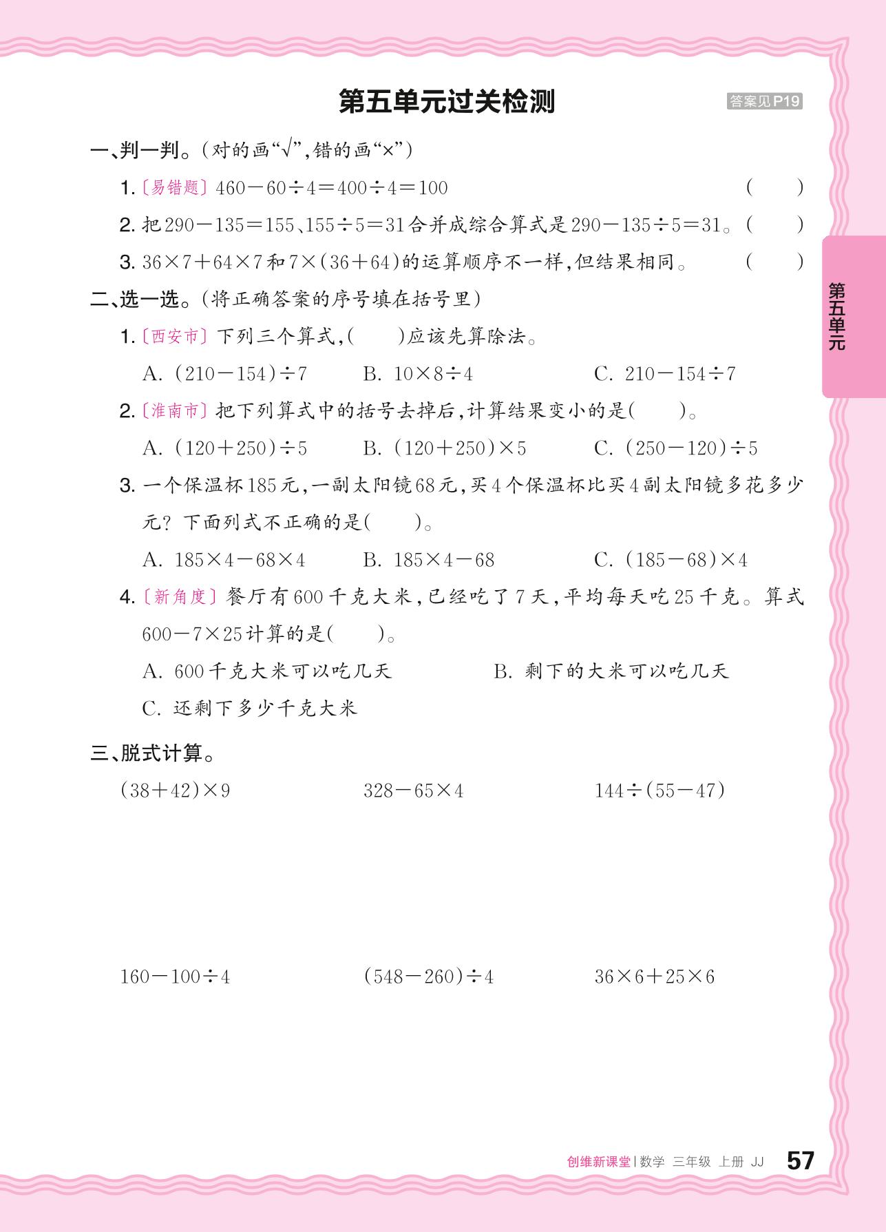 2024秋上册三年级数学冀教版 第五单元过关检测