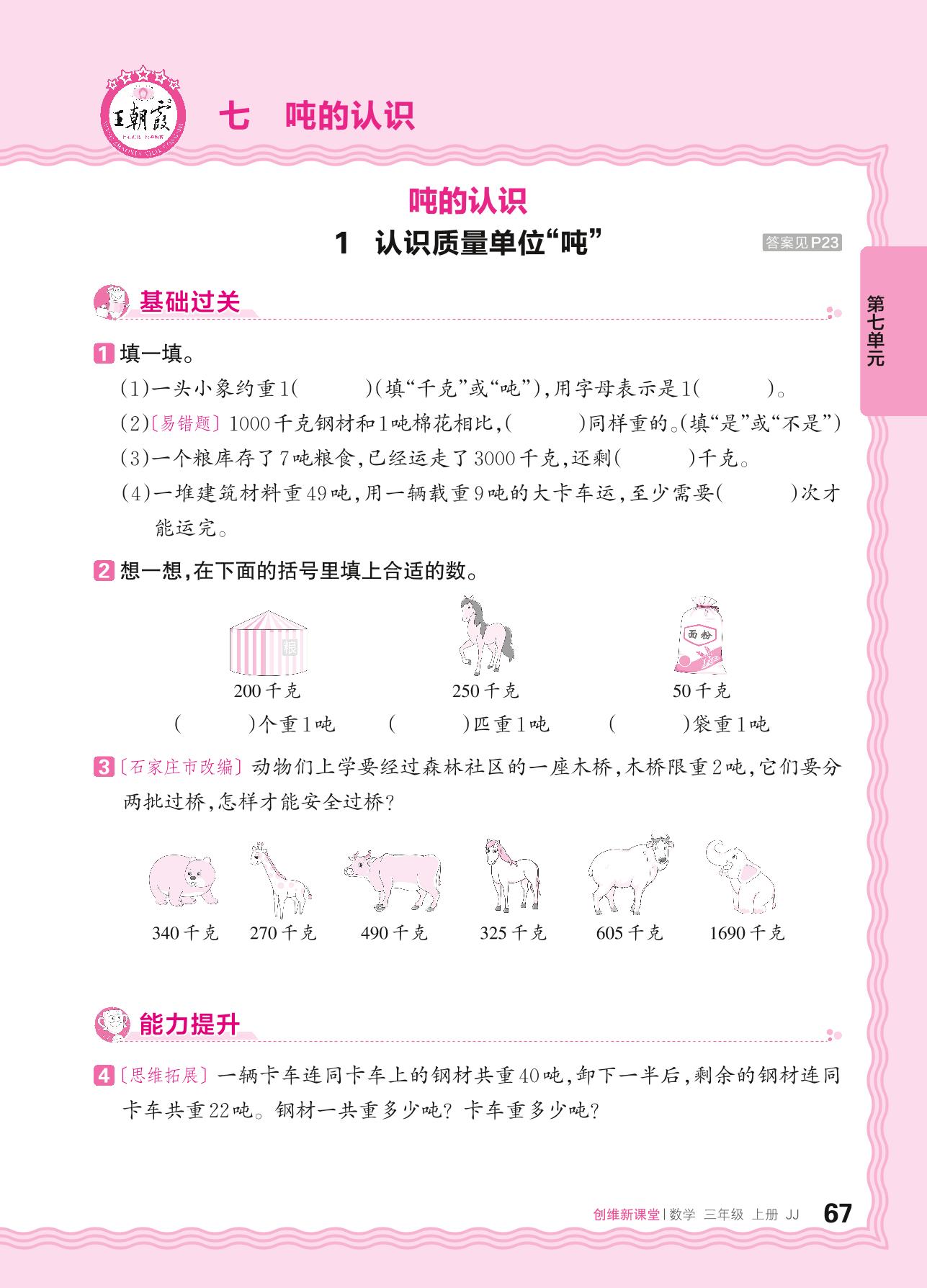 2024秋上册三年级数学冀教版 第七单元 吨的认识——1. 认识质量单位“吨”