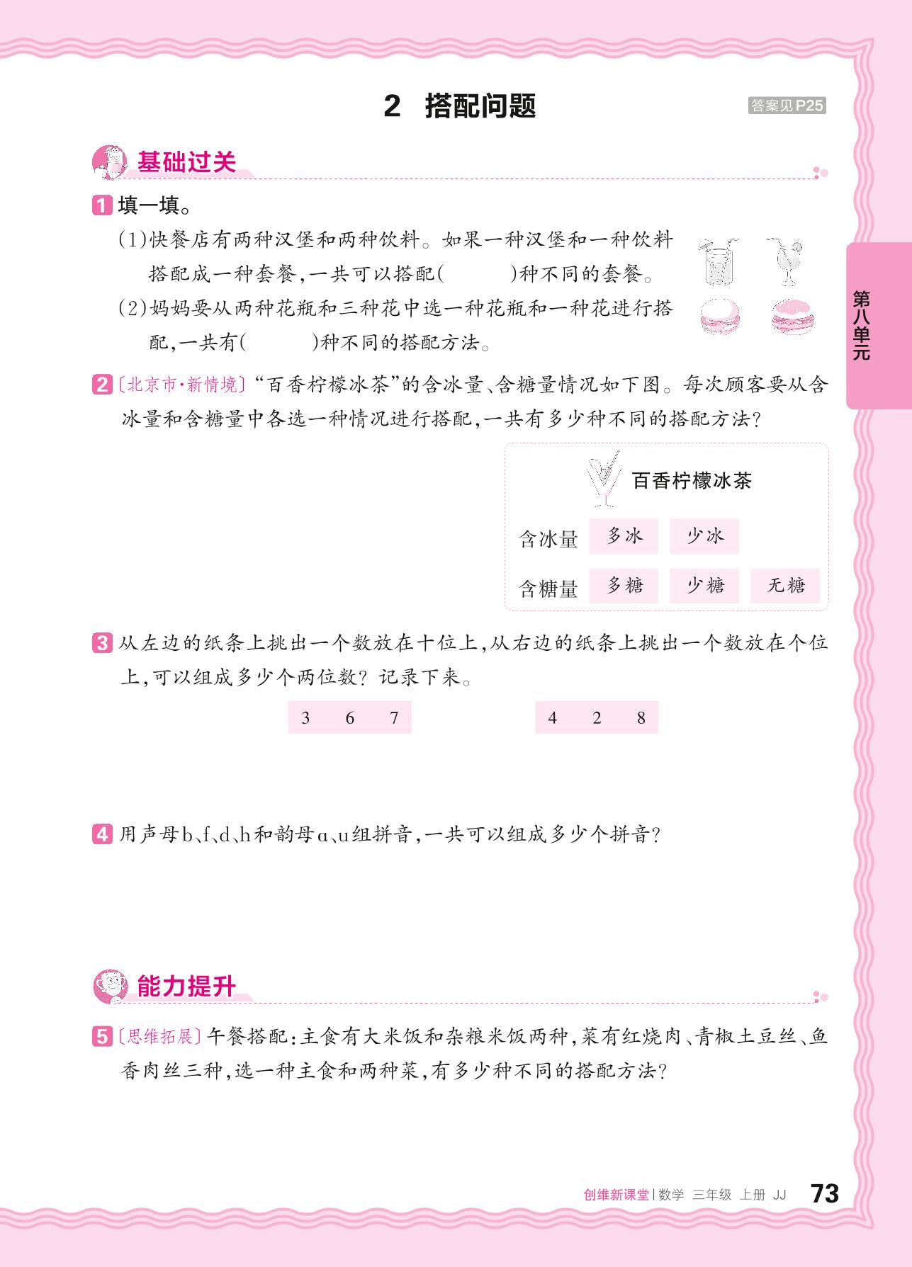 2024秋上册三年级数学冀教版 第八单元 探索乐园——2. 搭配问题