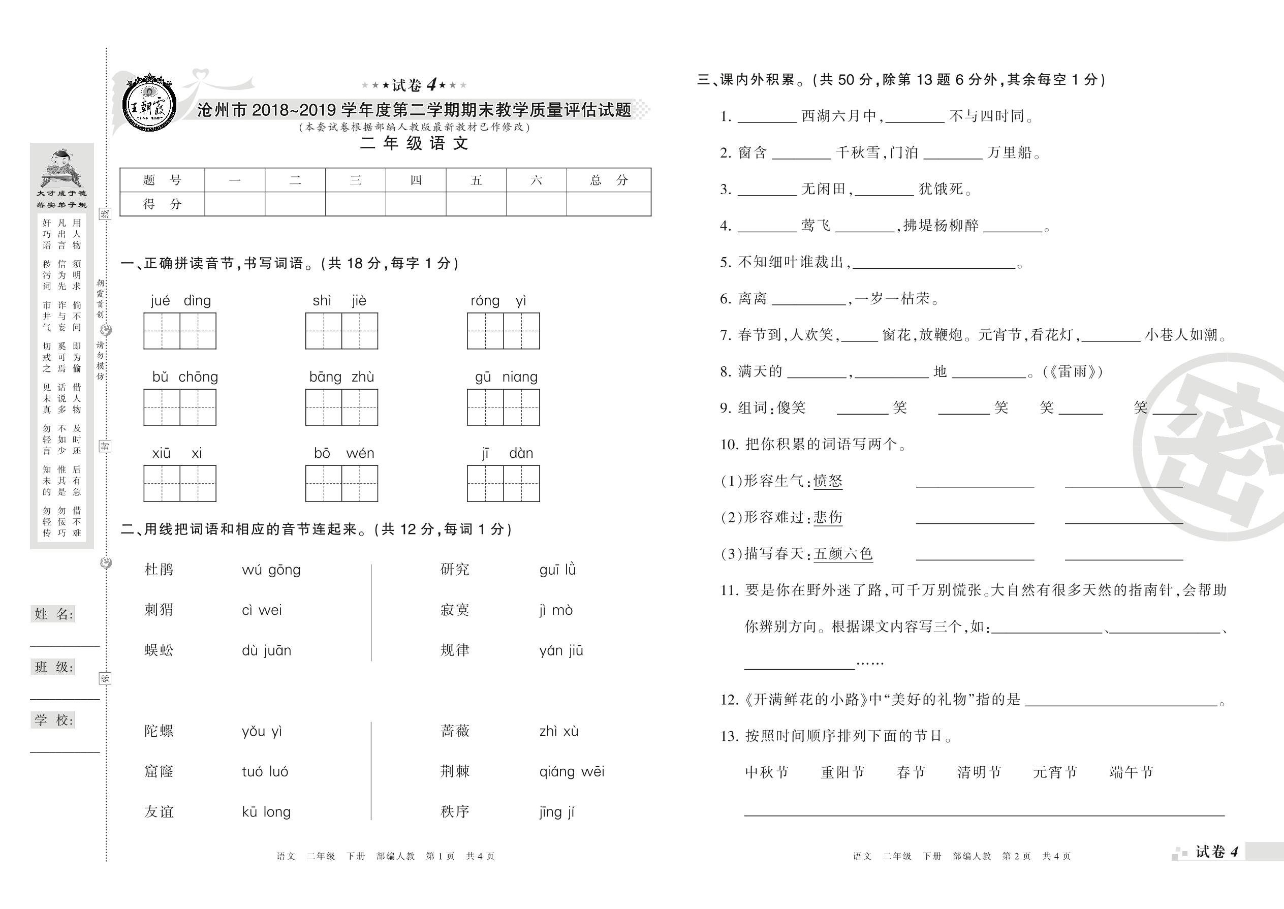 2018-2019学年第二学期沧州市二年级语文试卷(人教版)【4】