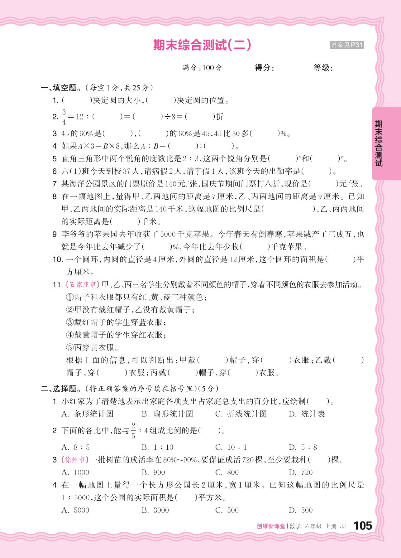2024秋上册六年级数学冀教版 期末综合测试(二)