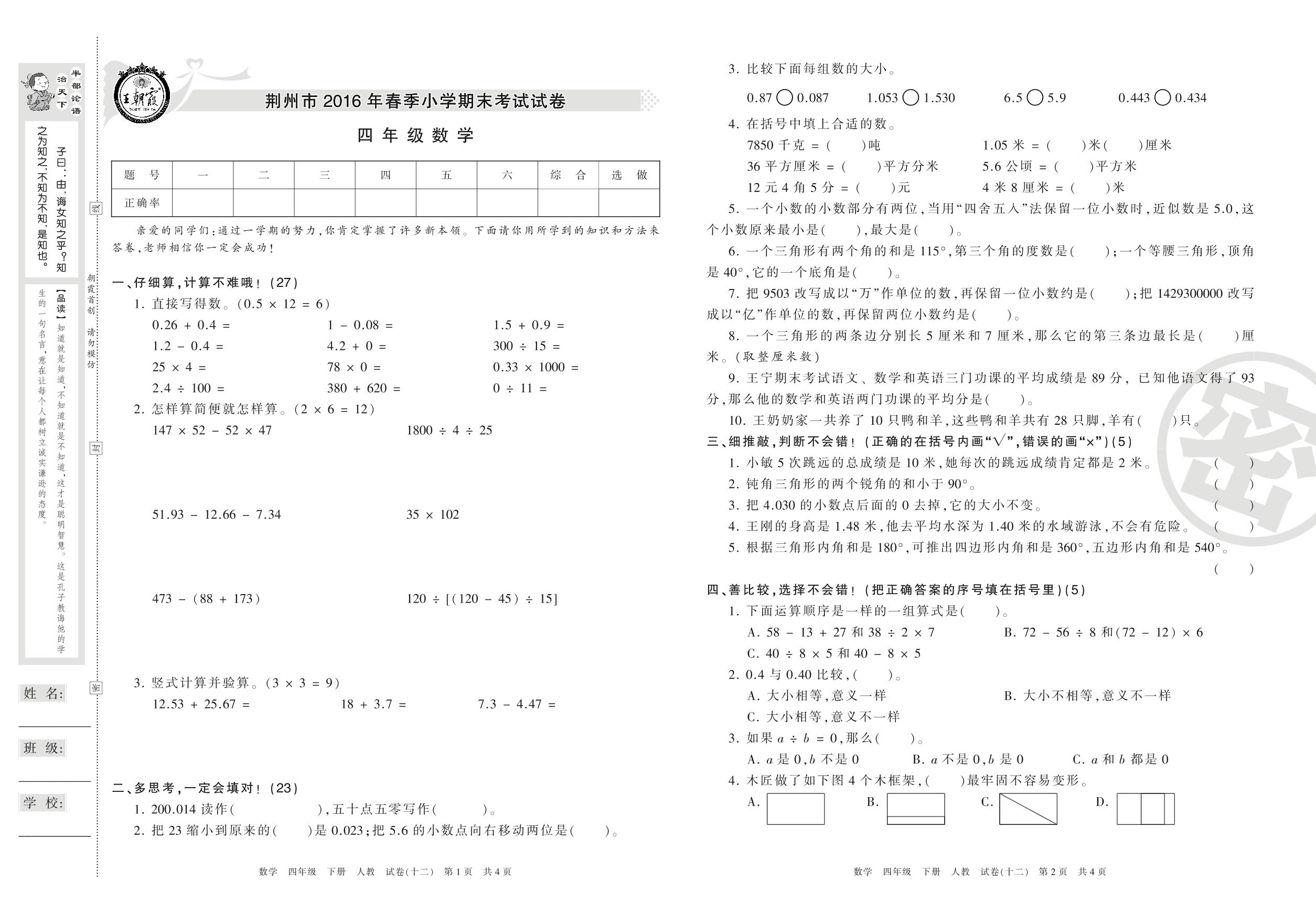 2015-2016学年第二学期荆州市四年级数学试卷(人教版)【12】