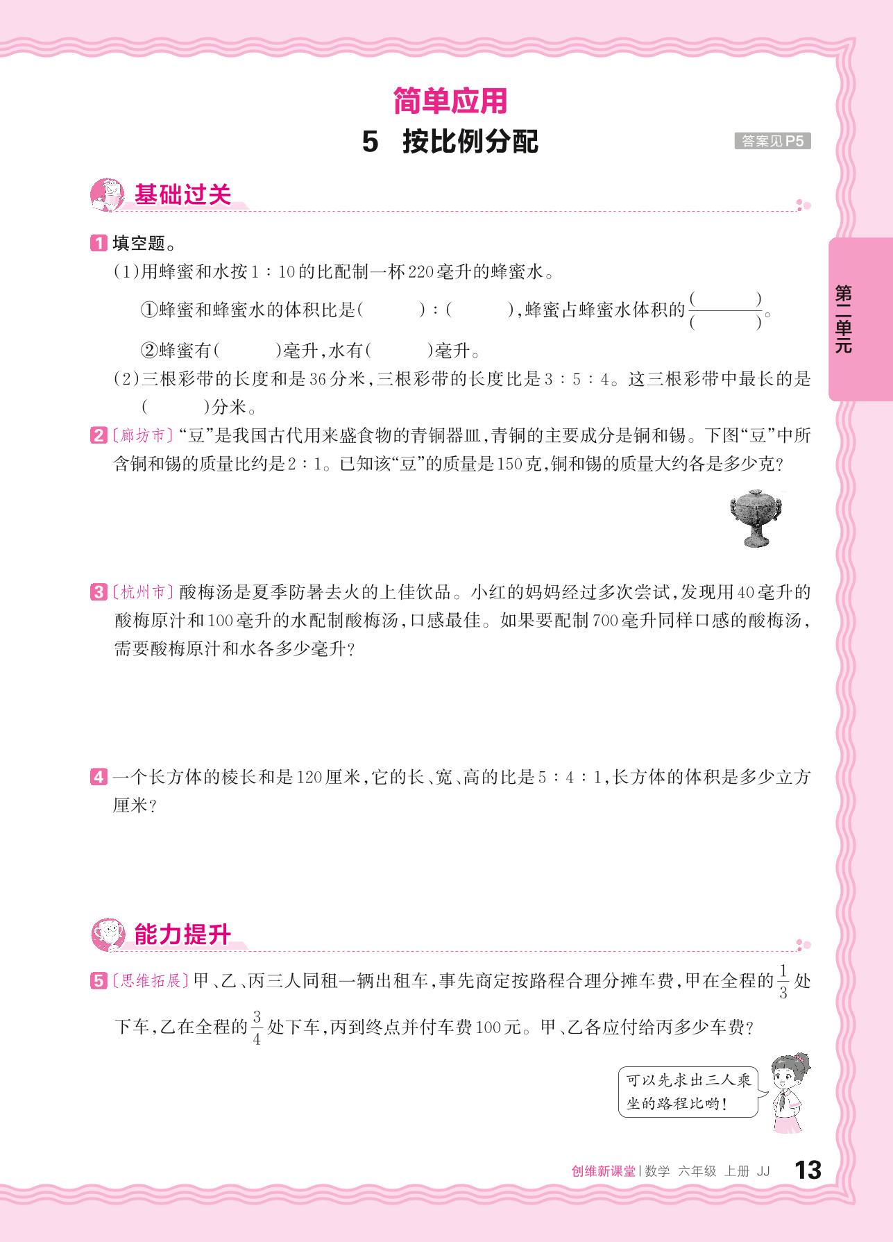 2024秋上册六年级数学冀教版 第二单元 比和比例——5. 按比例分配