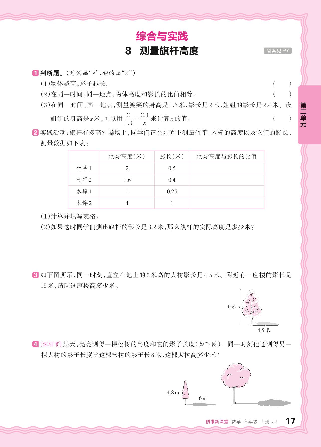 2024秋上册六年级数学冀教版 第二单元 比和比例——8. 测量旗杆高度