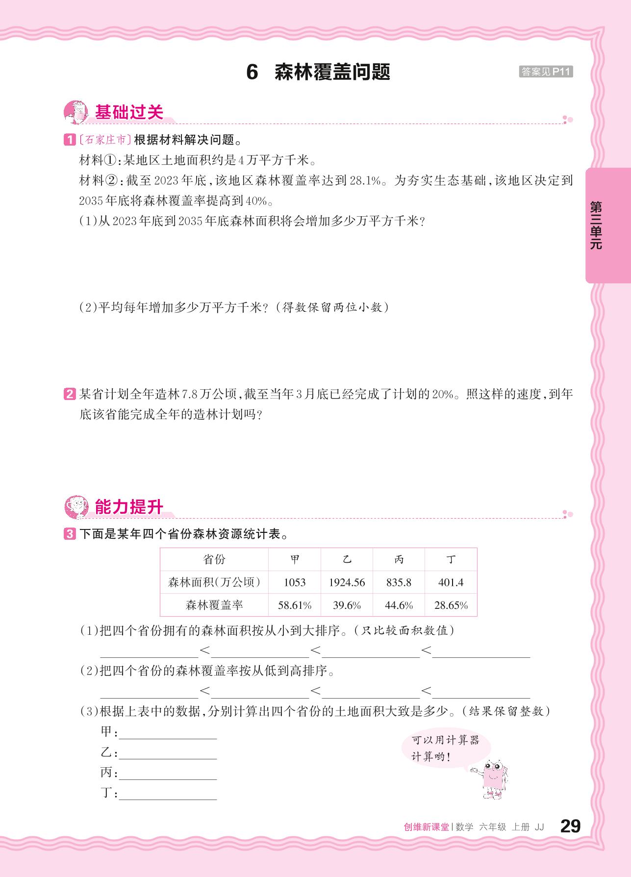 2024秋上册六年级数学冀教版 第三单元 百分数——6. 森林覆盖问题