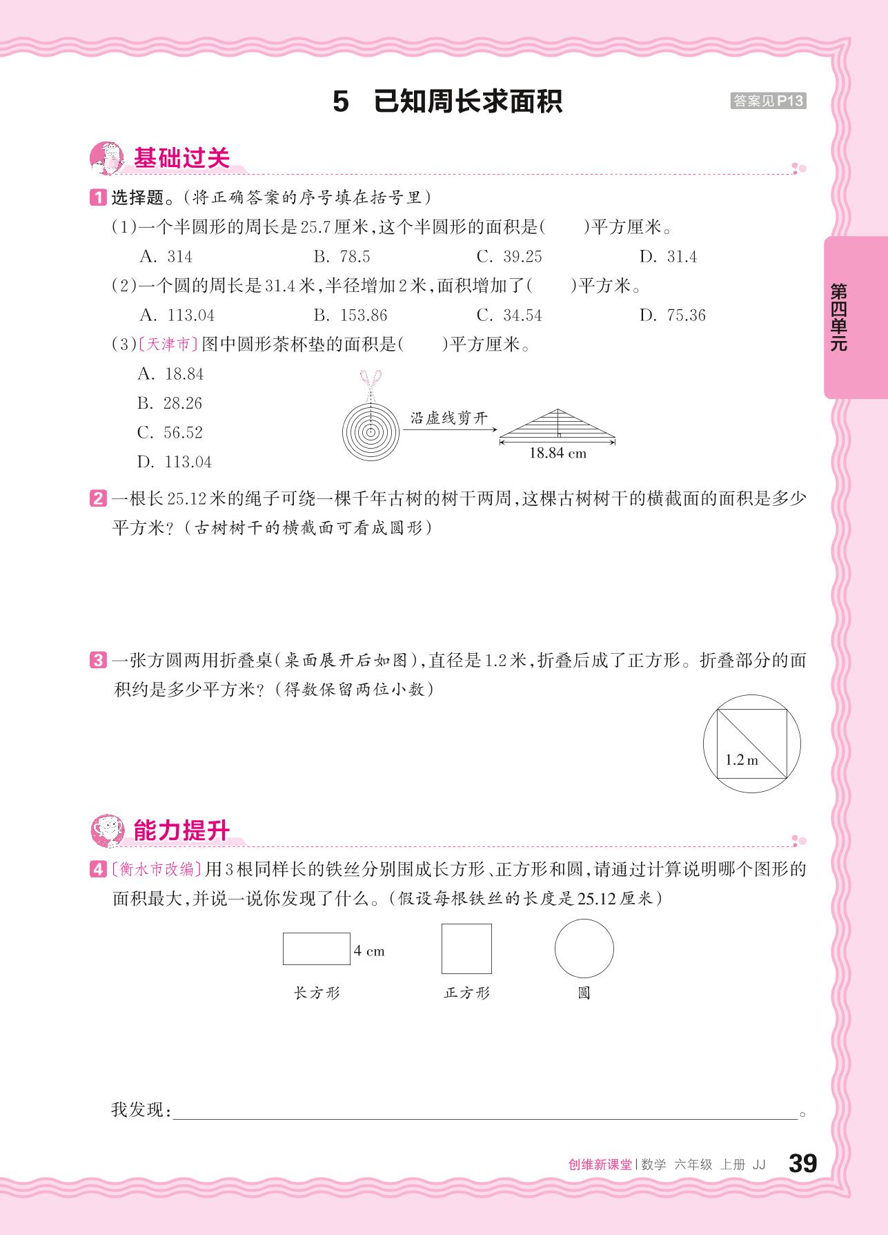 2024秋上册六年级数学冀教版 第四单元 圆的周长和面积——5. 已知周长求面积