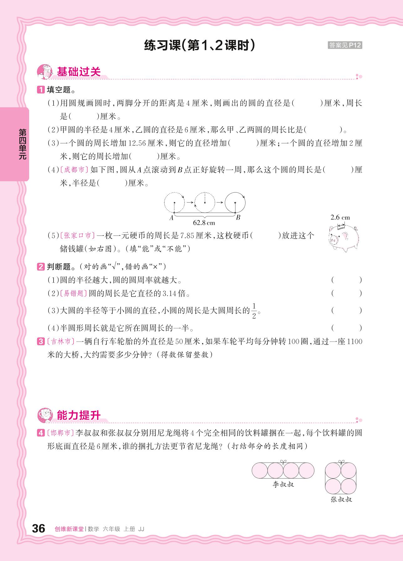 2024秋上册六年级数学冀教版 第四单元 圆的周长和面积——圆的周长练习课