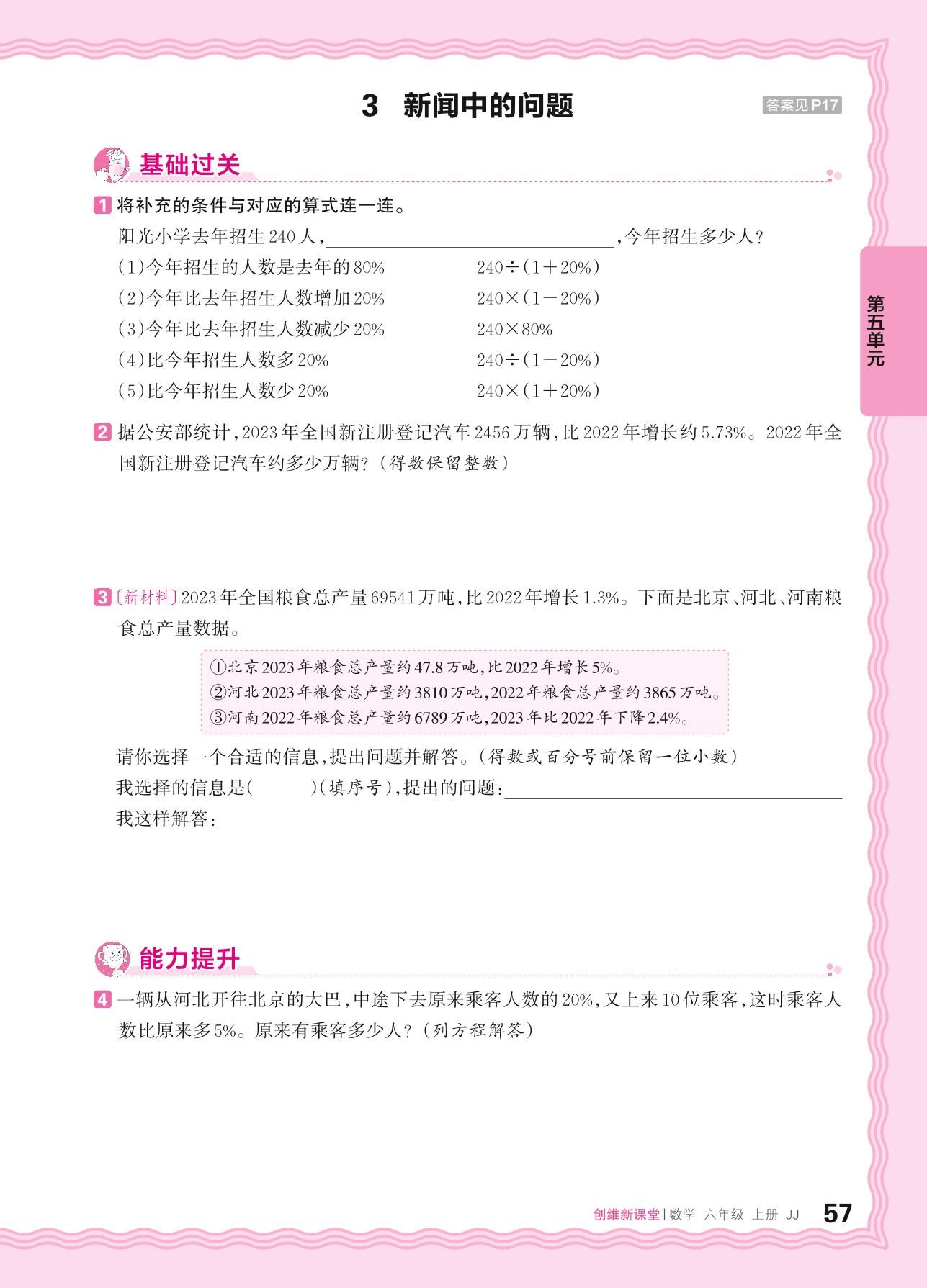 2024秋上册六年级数学冀教版 第五单元 百分数的应用——3. 新闻中的问题