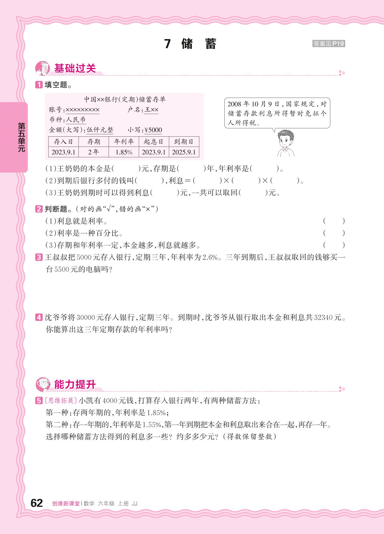 2024秋上册六年级数学冀教版 第五单元 百分数的应用——7. 储蓄